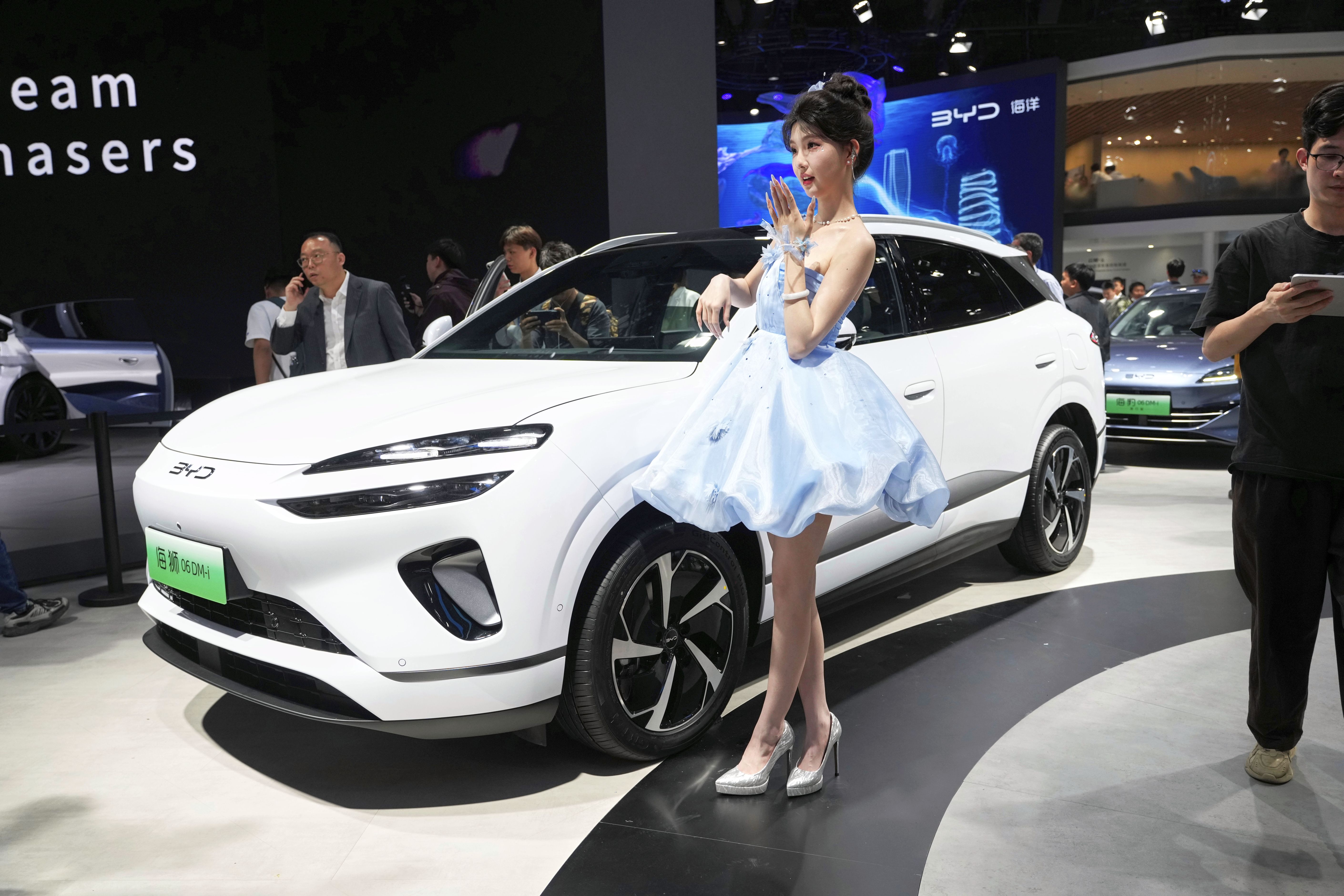 A model poses near the Sea Lion 06 DM-i model from BYD at the Shanghai auto show on Wednesday, April 23, 2025. (Photo by Ng Han Guan/AP Photo)