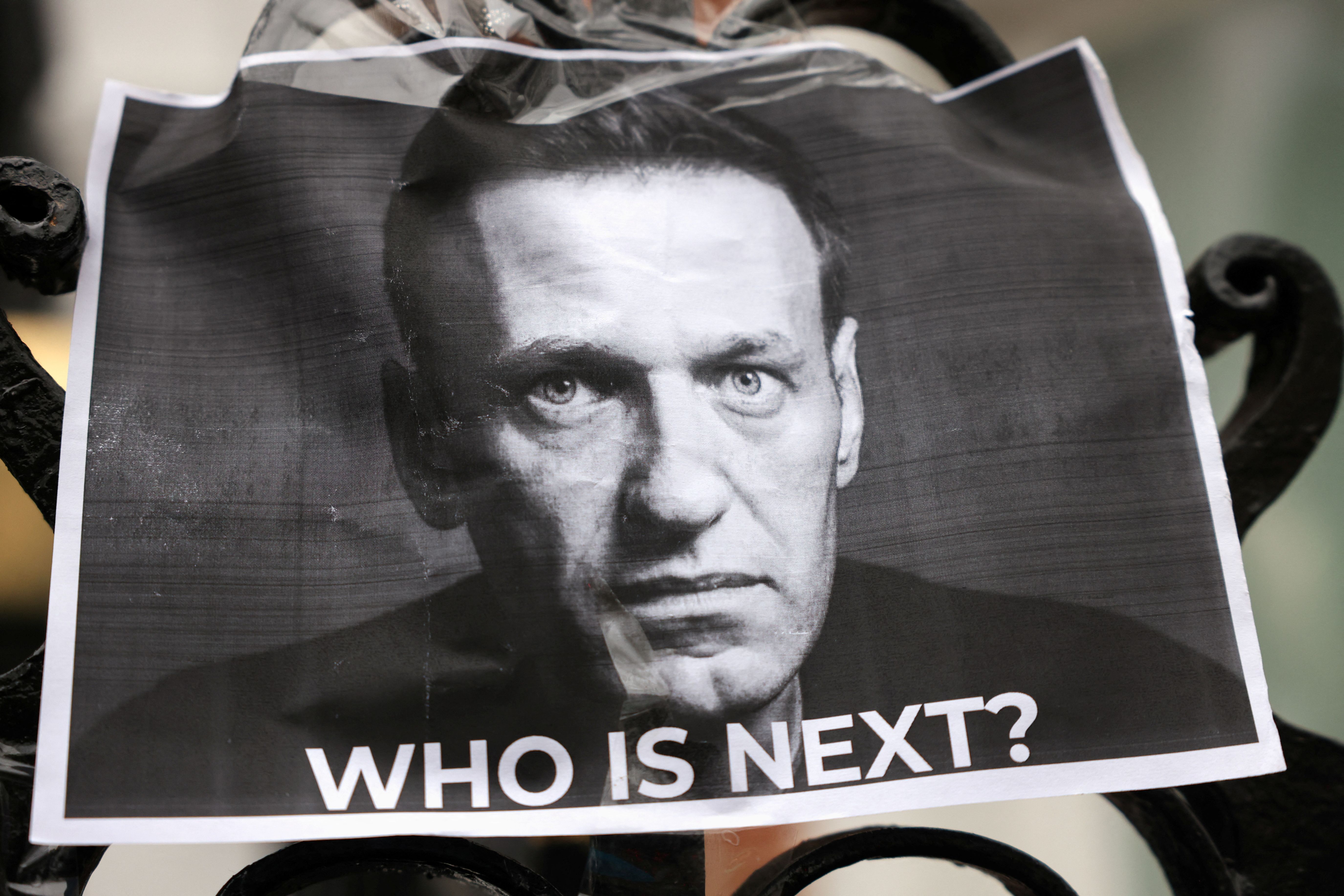 A picture of late Russian opposition leader Alexei Navalny is attached to a fence outside the Russian Embassy, in London, Britain on February 17, 2024. (Photo by Hollie Adams/Reuters)