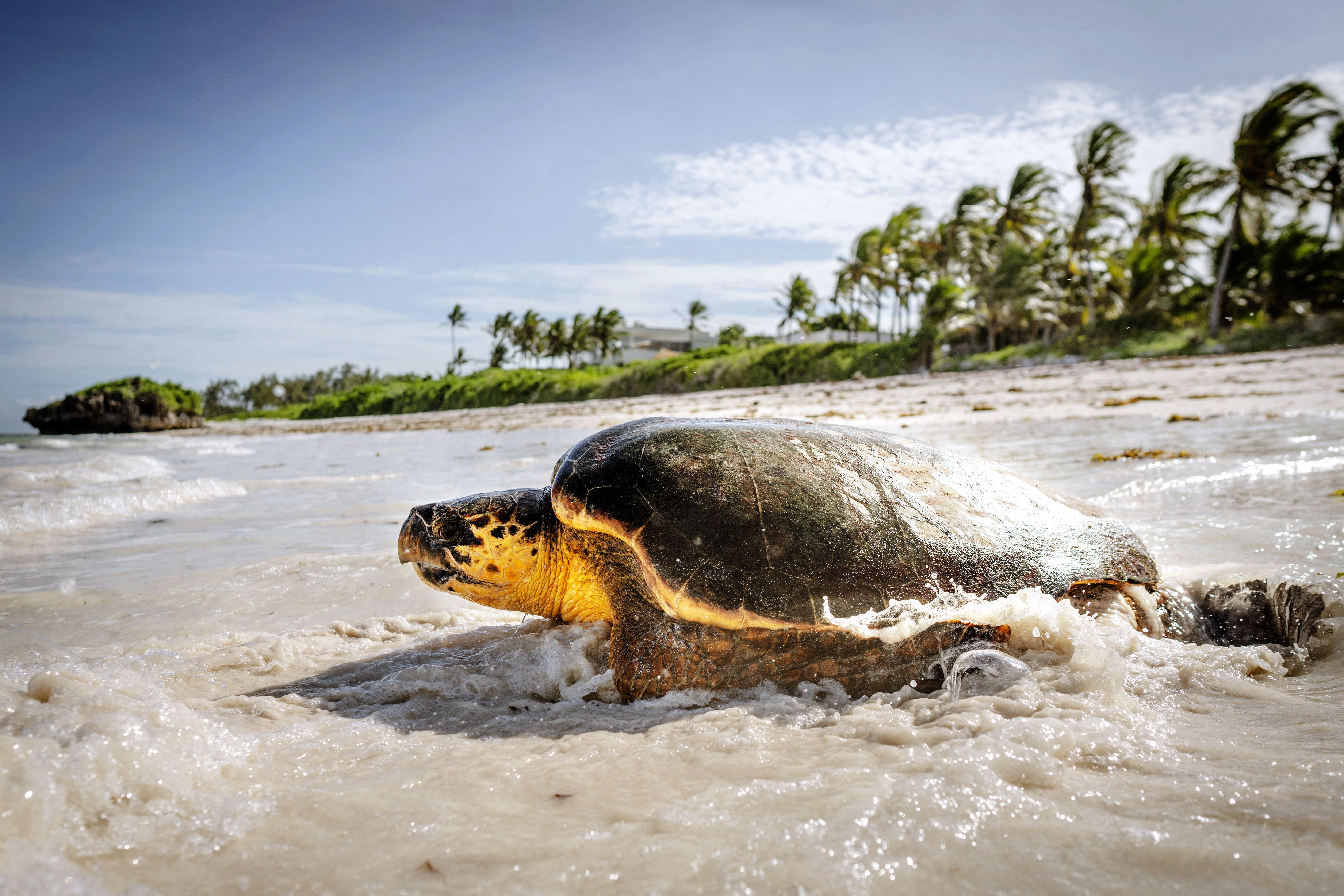 A matured Loggerhead sea turtle released by staff from Local conservation makes its way back into the ocean, in Watamu on May 23, 2025. Local Ocean Conservation protects 50-100 turtle nests along the beaches in Watamu each year and works closely with fishermen to rescue turtles accidentally caught in fishing gear. Since 1998, over 24,000 turtles have been rescued, assessed, tagged, and released back into the ocean. At the turtle rehabilitation centre, sick and injured turtles often suffering from wounds, exhaustion, or diseases like Fibropapillomatosis, receive care before being returned to the wild, the centre not only help turtles but is also open to visitors and schools, as well as researchers and volunteers. (Photo by Fredrik Lerneryd/AFP Photo)