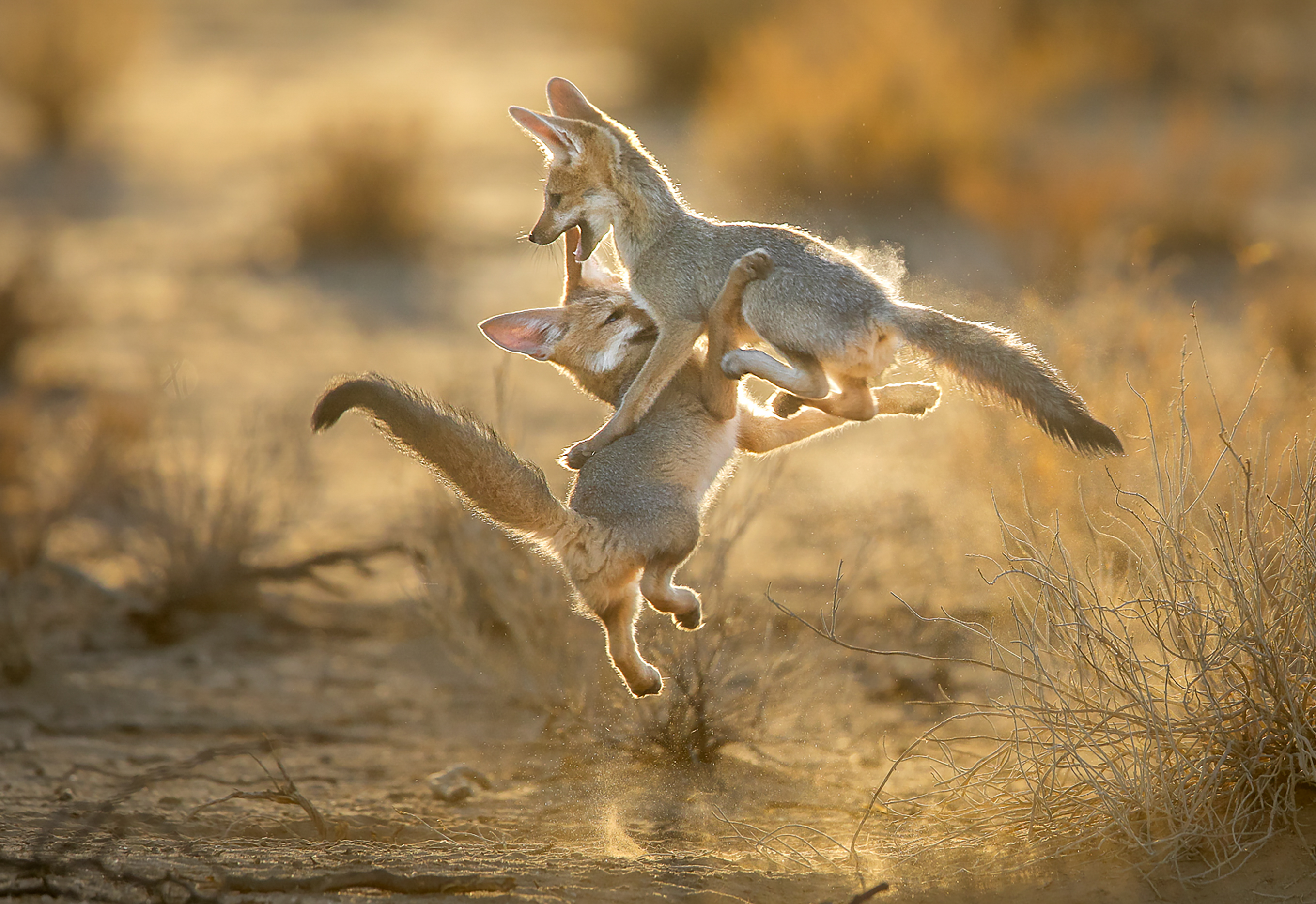 Cape fox cubs play fight in the last decade of May 2025 in the Kalahari Desert, South Africa, their silver and yellow fur camouflaging them in the desert. (Photo by John Mullineux/Solent News & Photo Agency)