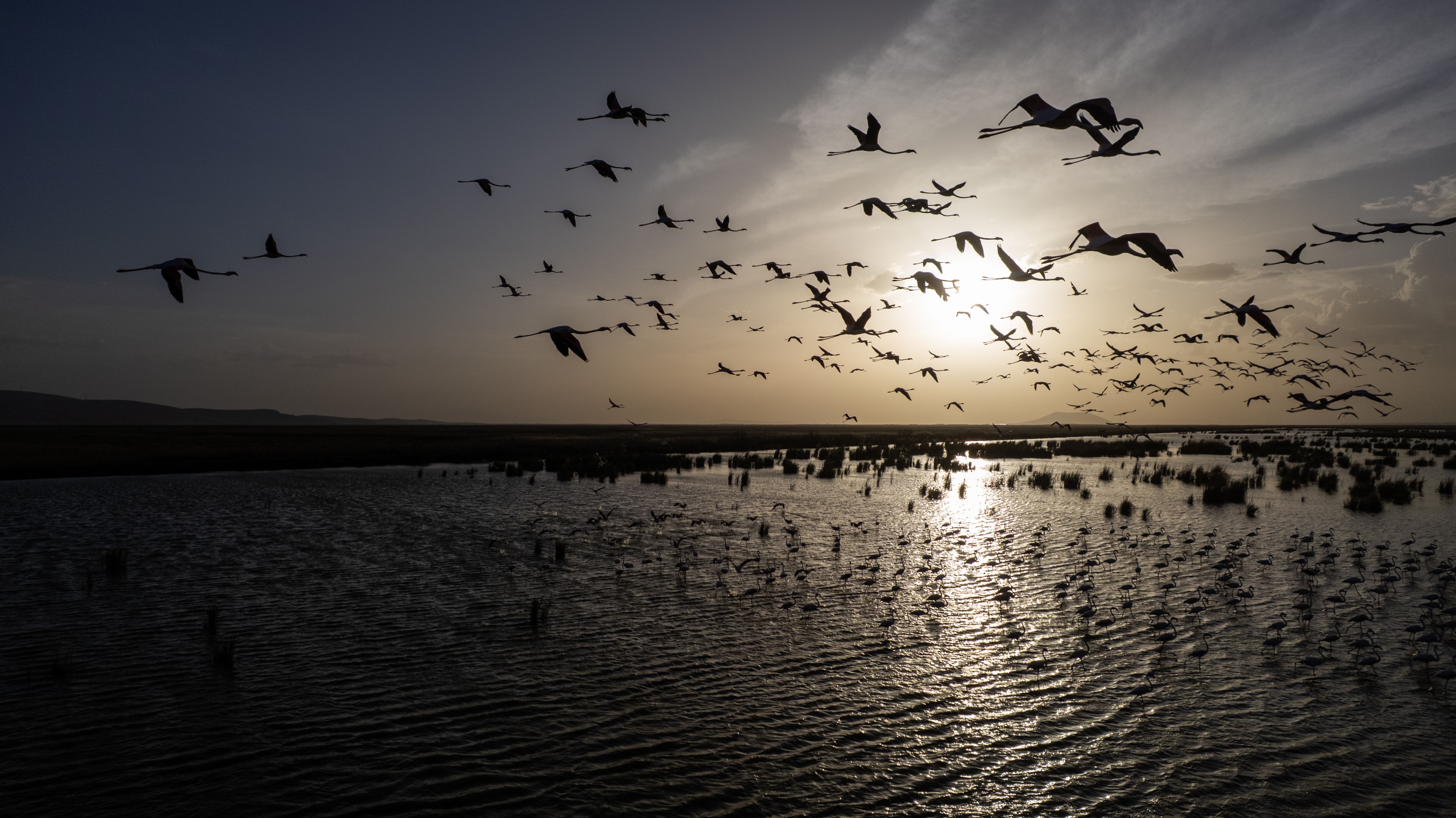 An aerial view of Akgol Reeds, one of Turkiye's most important wetlands, is home to Anatolia's 'crane in blush' flamingos, rice paddy and different bird species in Eregli district of Konya, Turkiye on May 25, 2025. Akgol Reeds, known as Konya's bird paradise, is among the places frequented by photography enthusiasts and nature lovers. (Photo by Engin Ayyildiz/Anadolu via Getty Images)