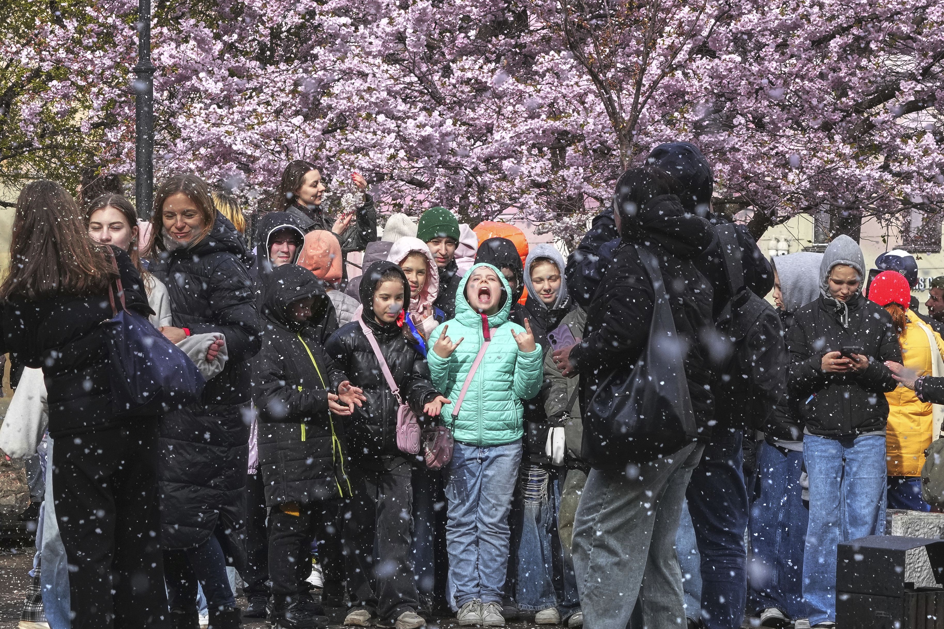 Children pose for a group photo backdropped by cherry blossom trees in the Friendship Garden of St. Petersburg, on a snowy April 26, 2025. (Photo by Dmitri Lovetsky/AP Photo)