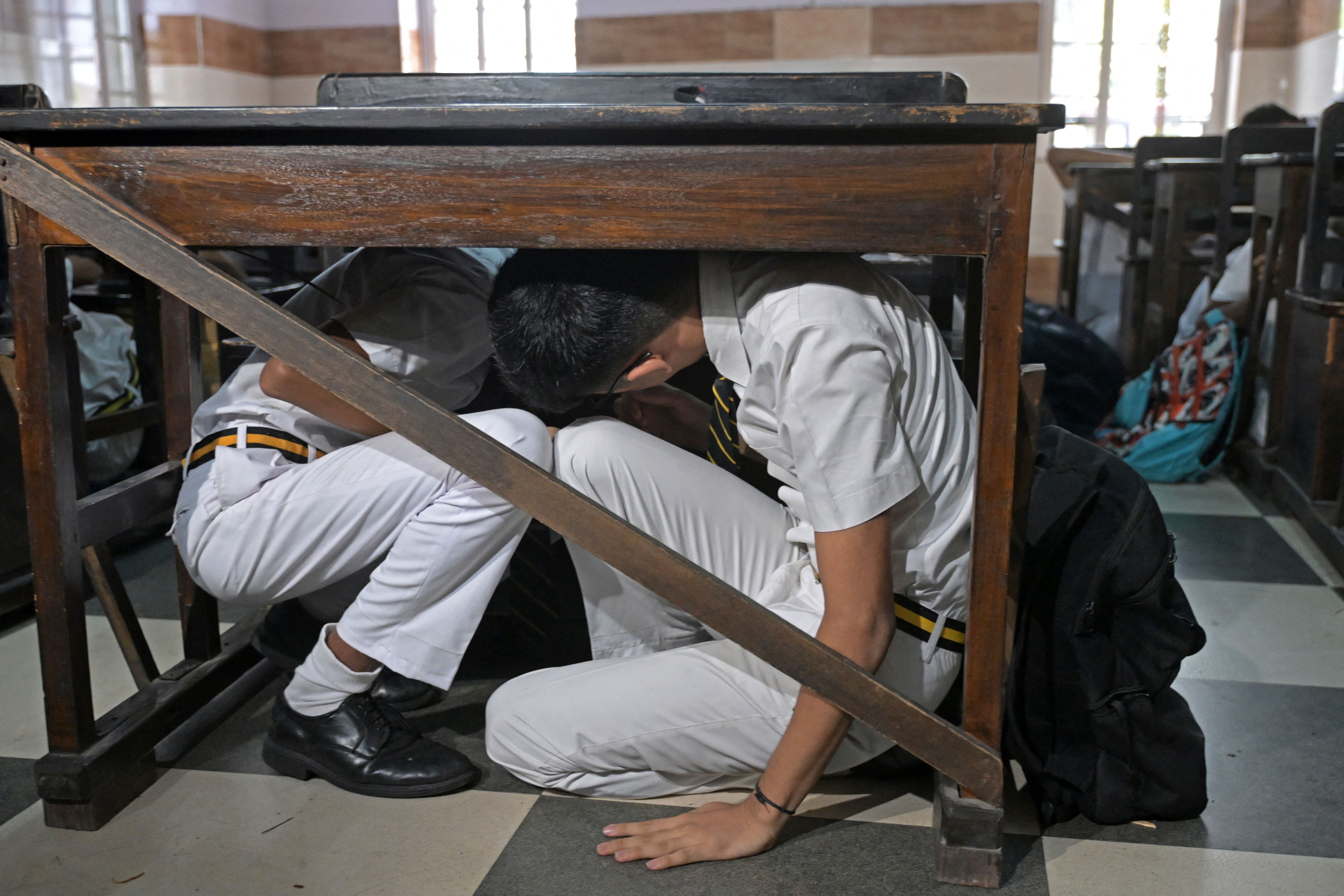 Students take part in an emergency simulation drill as part of the nationwide civil defence mock drill at a school in Kolkata on May 7, 2025, as border tensions surge. India and Pakistan exchanged heavy artillery along their contested frontier on Wednesday, after New Delhi launched deadly missile strikes on its arch-rival in the worst violence between the nuclear-armed neighbours in two decades. India conducted several civil defence drills on May 7, while schools in Pakistan's Punjab and Kashmir were closed, local government officials said. (Photo by Dibyangshu Sarkar/AFP Photo)