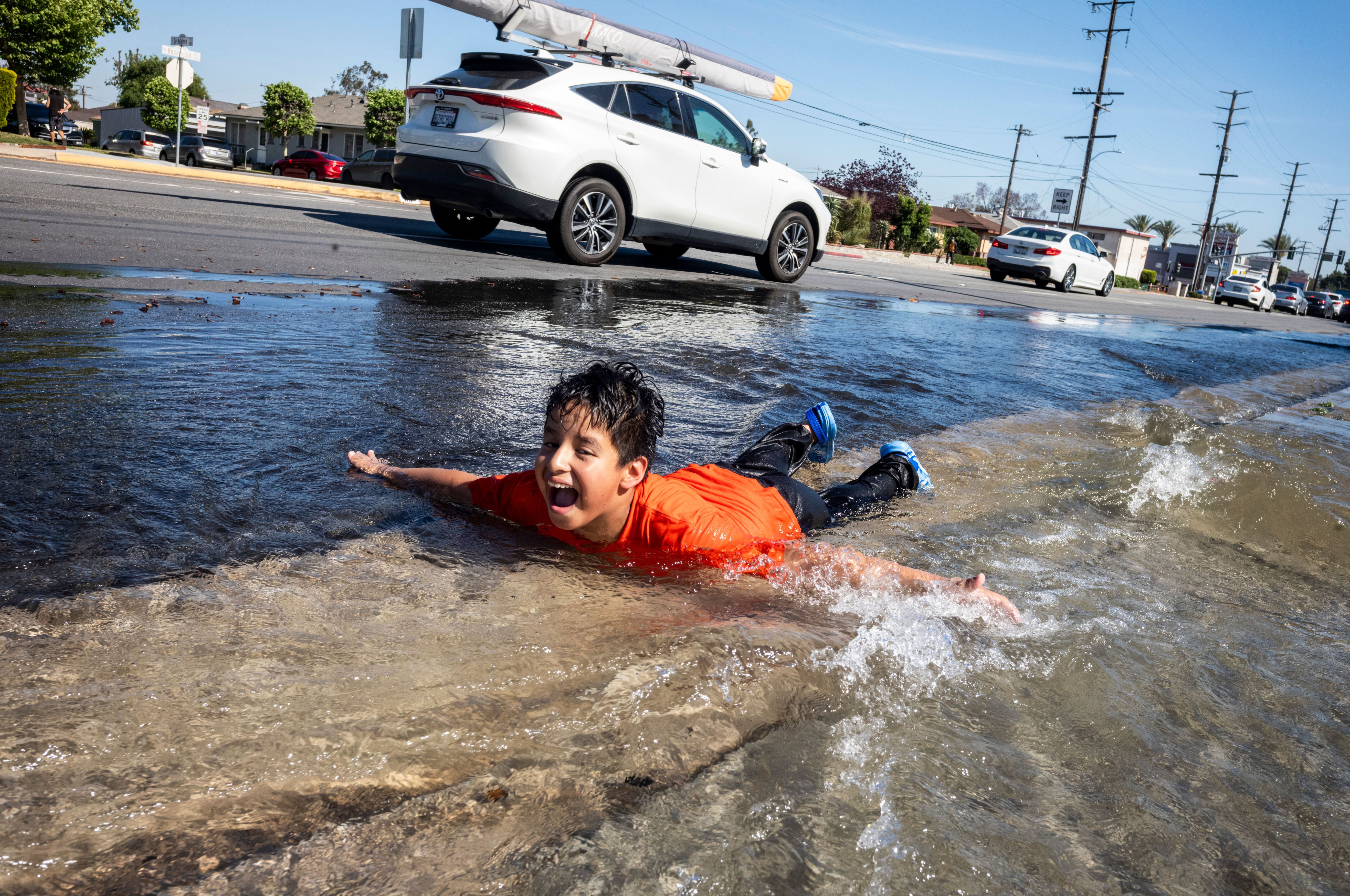 A boy plays in water from a broken fire hydrant in Rosemead, California on Saturday, May 10, 2025, seeking relief as spring heat breaks temperature records across the Southland. (Photo by Ringo Chiu/ZUMA Press Wire/Rex Features/Shutterstock)