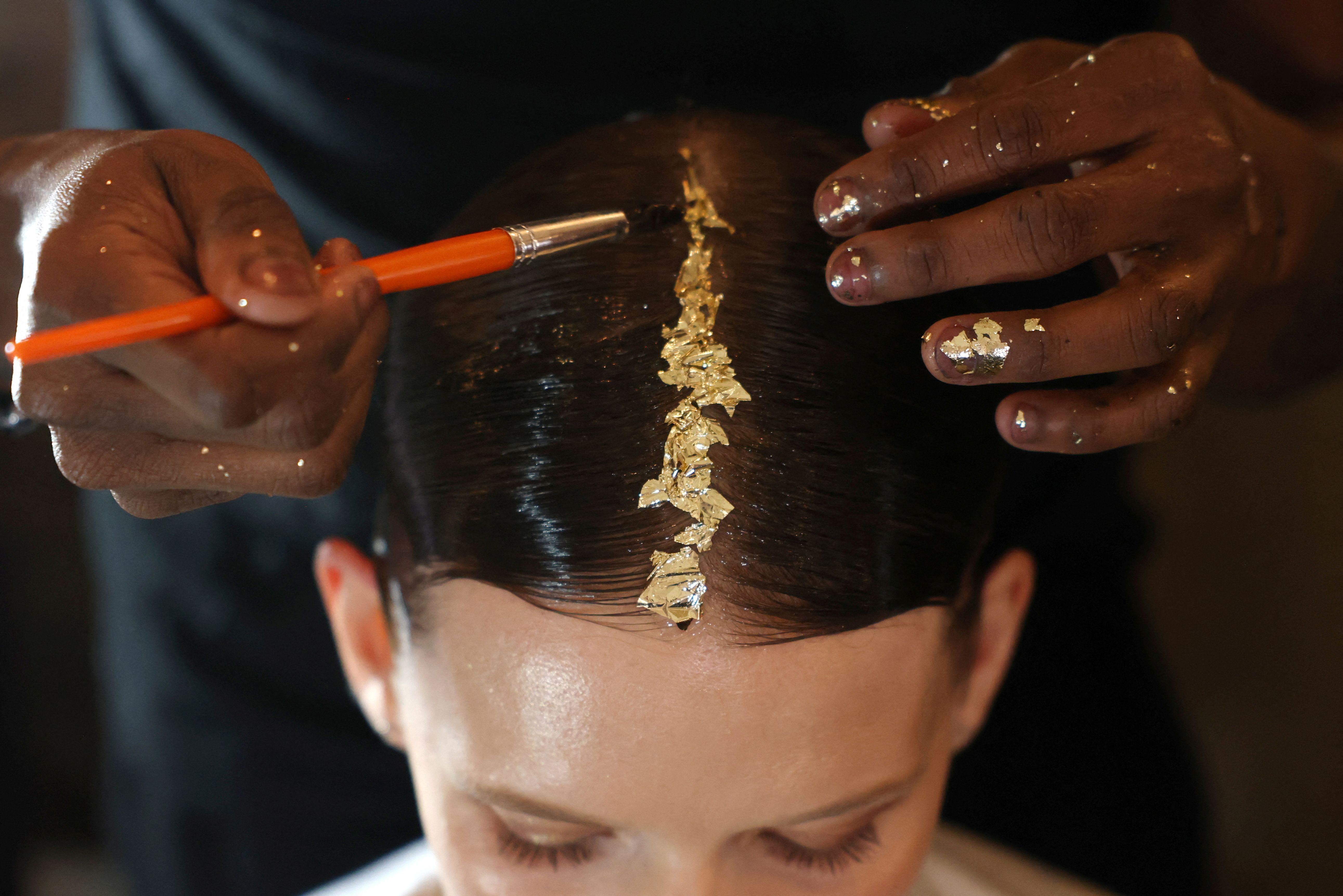 A model is prepared backstage before the Christian Siriano Fall/Winter 2024 collection show at New York Fashion Week, in New York City, U.S., February 8, 2024. (Photo by Andrew Kelly/Reuters)