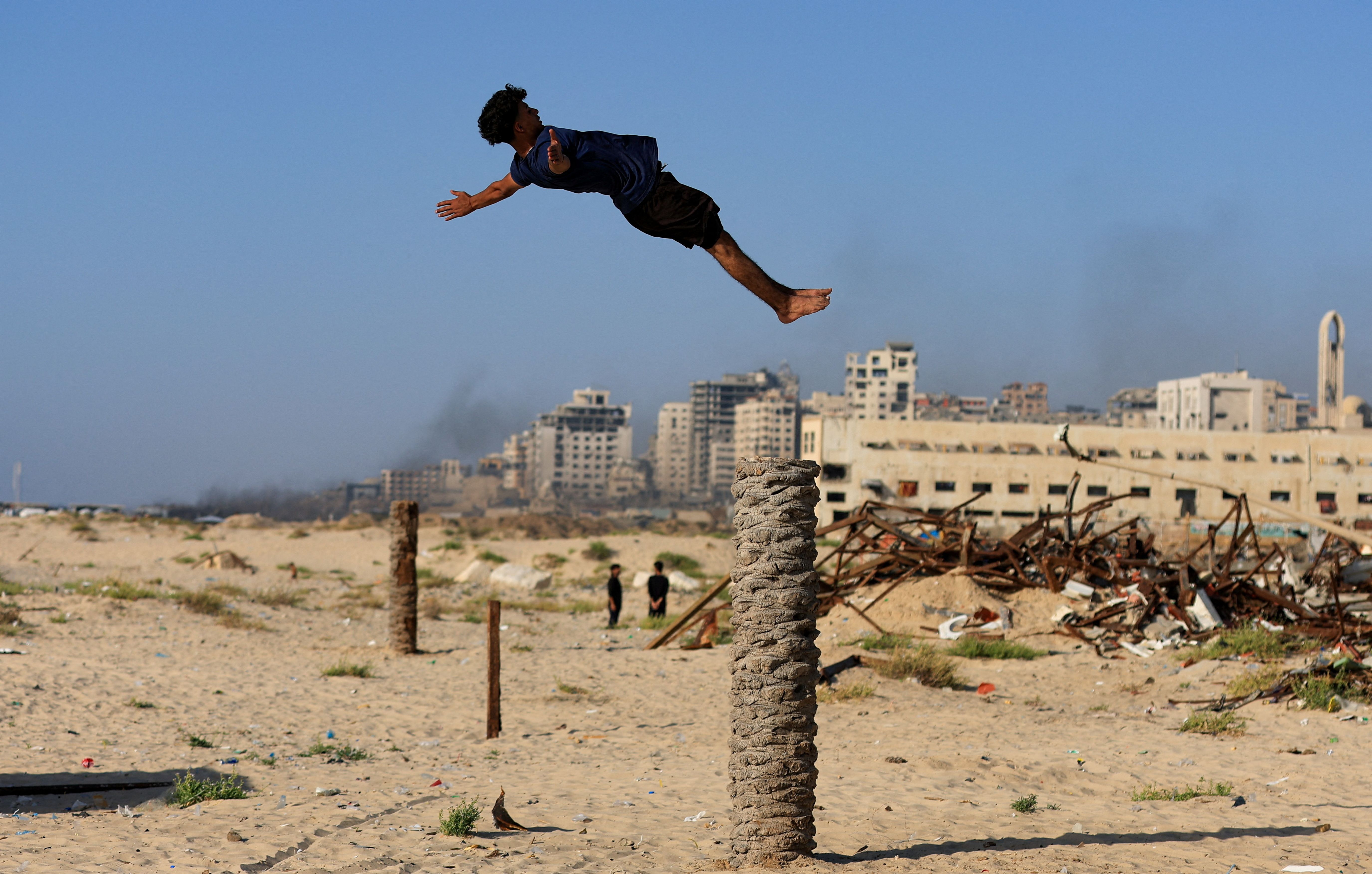 A Palestinian man demonstrates his parkour skills, in Gaza City, on May 9, 2025. (Photo by Dawoud Abu Alkas/Reuters)