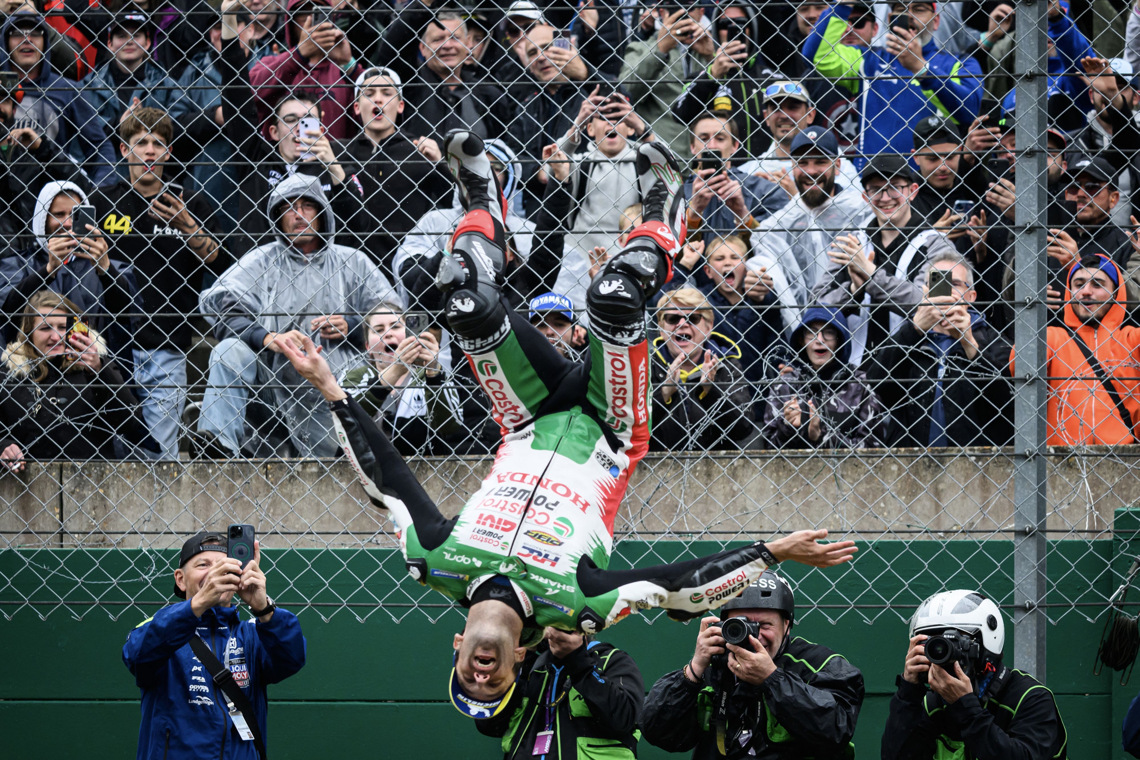 LRC Honda team's French MotoGP rider Johann Zarco celebrates with public after winning in the France Moto GP race at the Le Mans Circuit on May 11, 2025. (Photo by Loic Venance/AFP Photo)