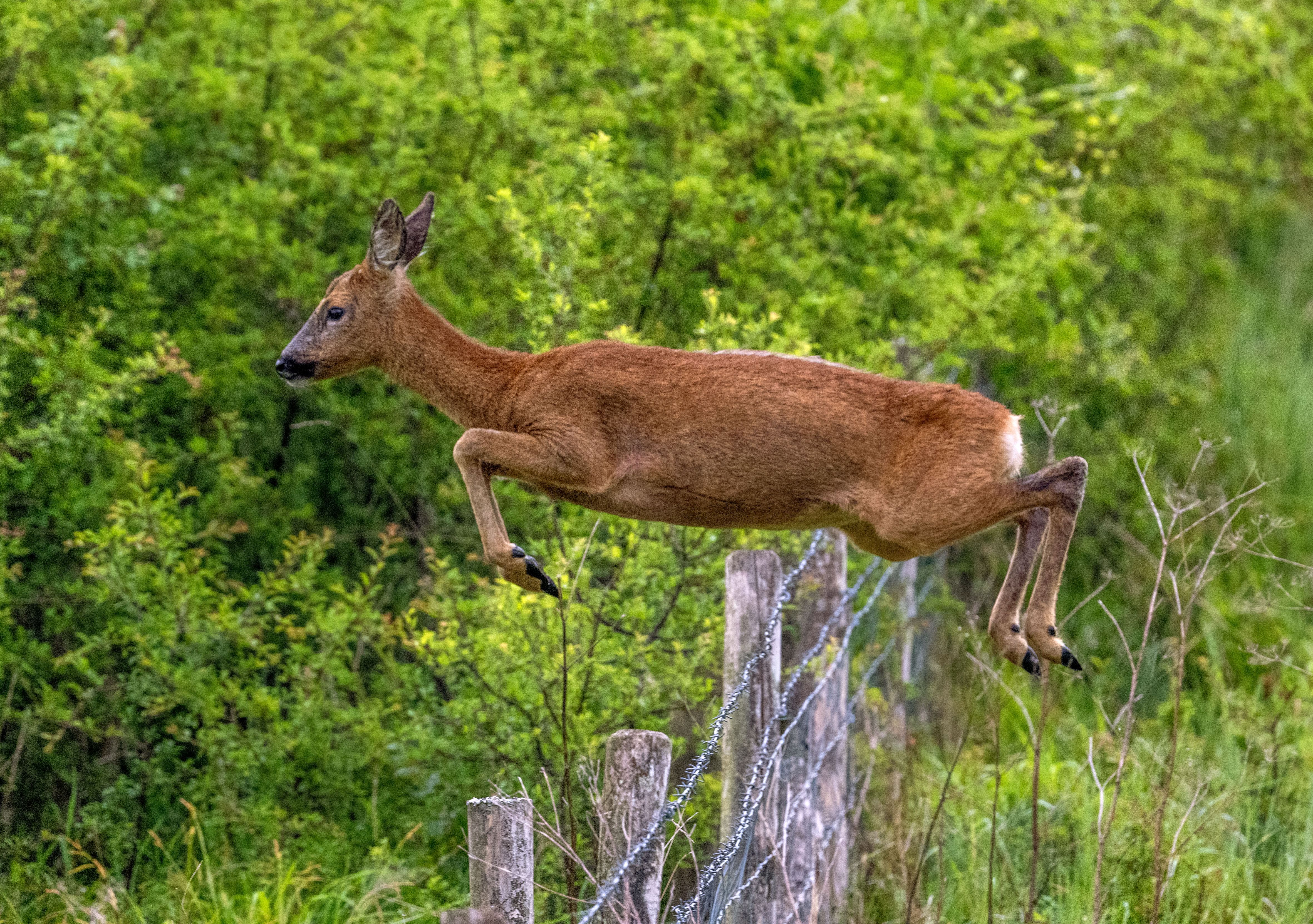 A roe deer jumps over a fence near Overton in Hampshire, UK on Monday, May 19, 2025. (Photo by Deborah Heath/Picture Exclusive)