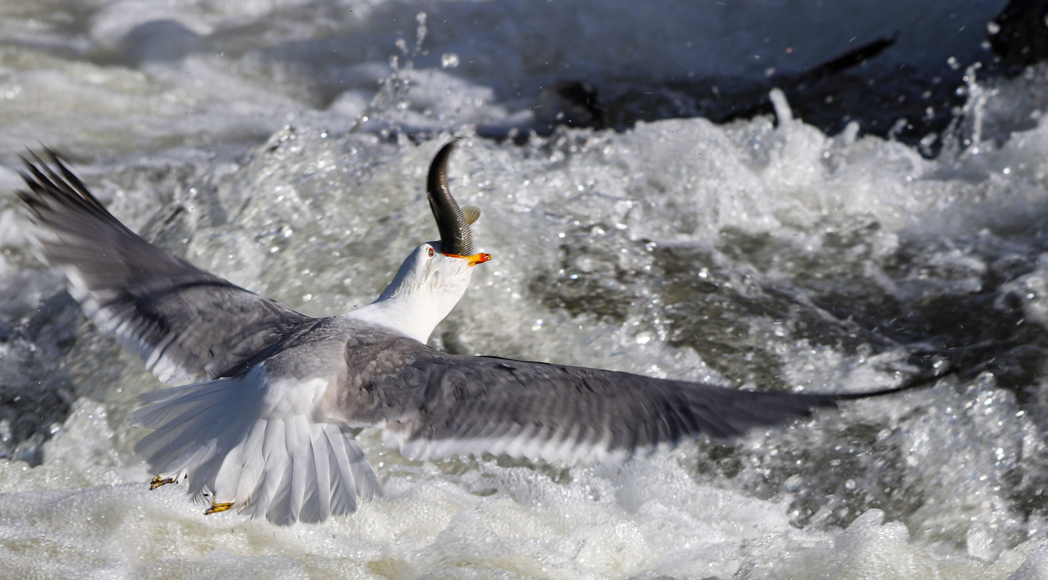 Seagulls hunt pearl mullets swimming upstream against the flow stream in Van, Turkiye on May 17, 2025. Every year during their spawning season, the pearl mullets live in the Lake Van, have to fight against seagulls feed on migrating fish, while migrating to fresh waters by swimming upstream against the flow stream. (Photo by Muhammed Onur Yavruturk/Anadolu via Getty Images)