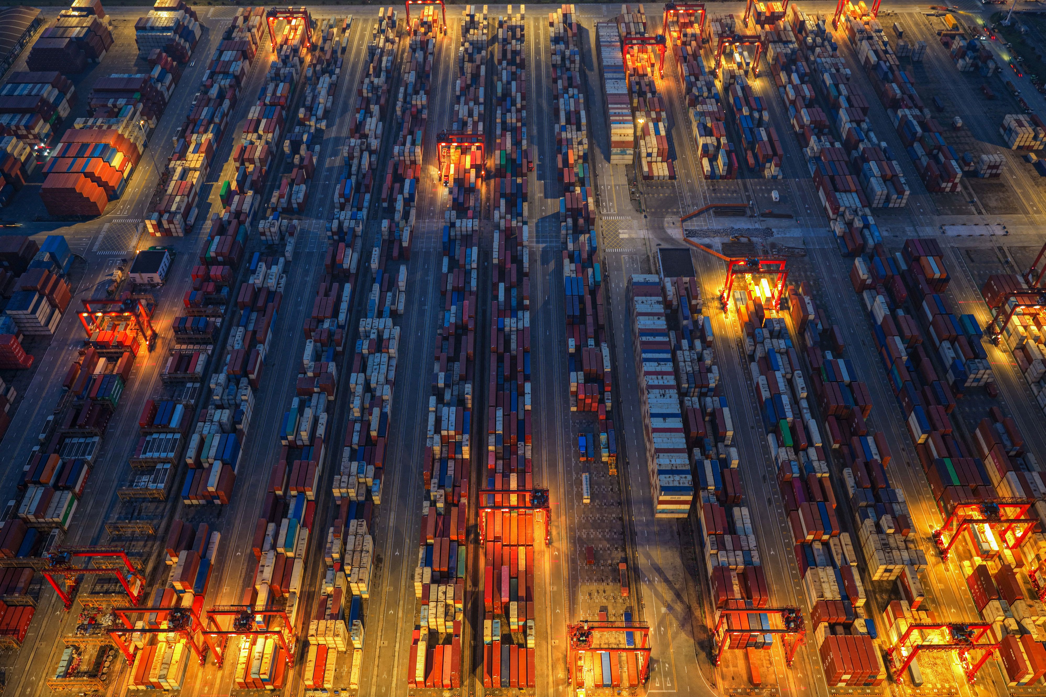 An aerial view shows containers stacked at a port in Taicang, in eastern China's Jiangsu province on May 18, 2025. (Photo by AFP Photo/China Stringer Network)