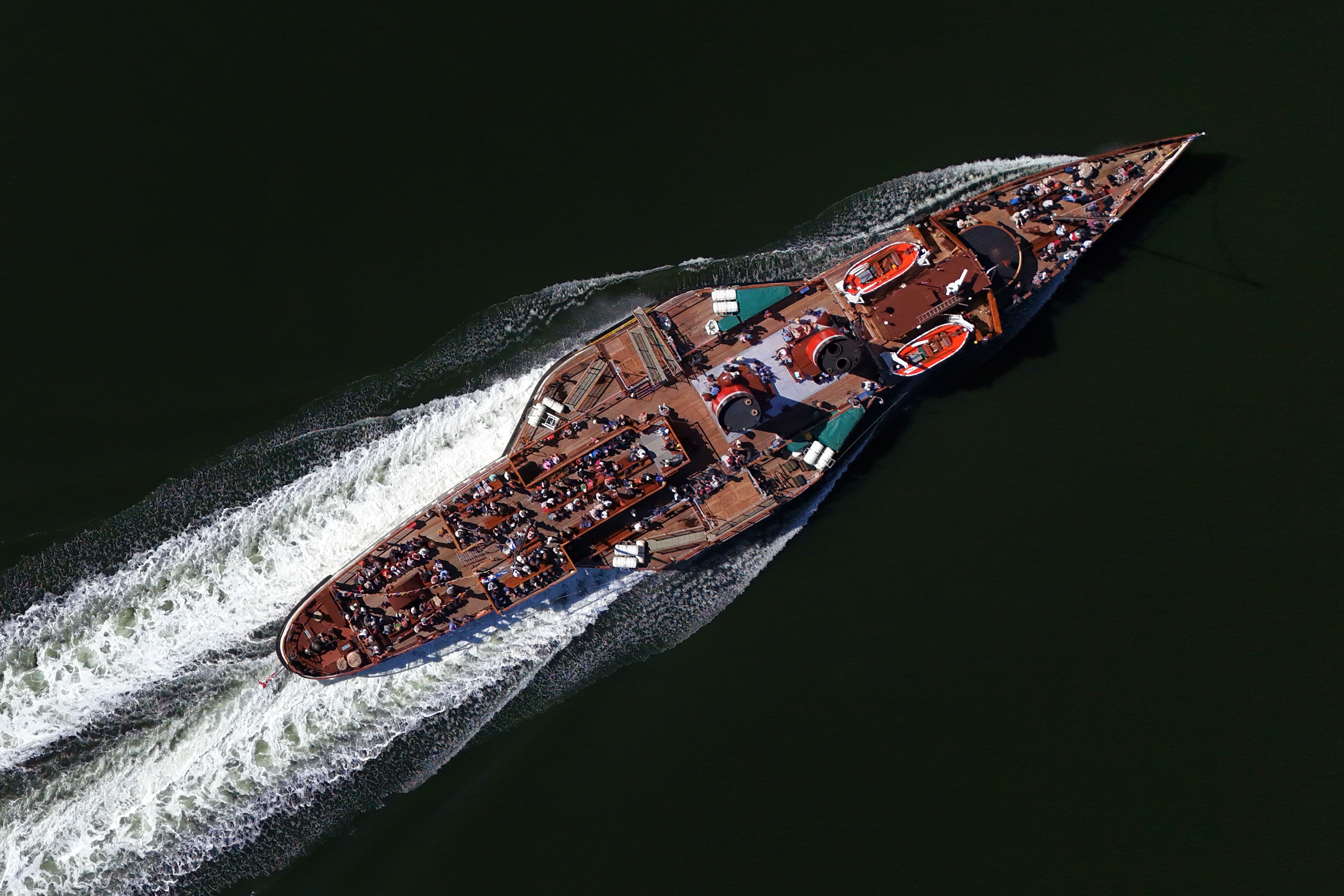 The Waverley, the world's last seagoing paddle steamer, as it makes its way along the River Clyde on the first sailing of the year on Friday, May 16, 2025. The Waverley was built in 1945, originally for the route up Loch Goil and Loch Long from Craigendoran & Arrochar in West Scotland. She now visits several areas of the UK offering regular trips during the summer months. (Photo by Jane Barlow/PA Wire)