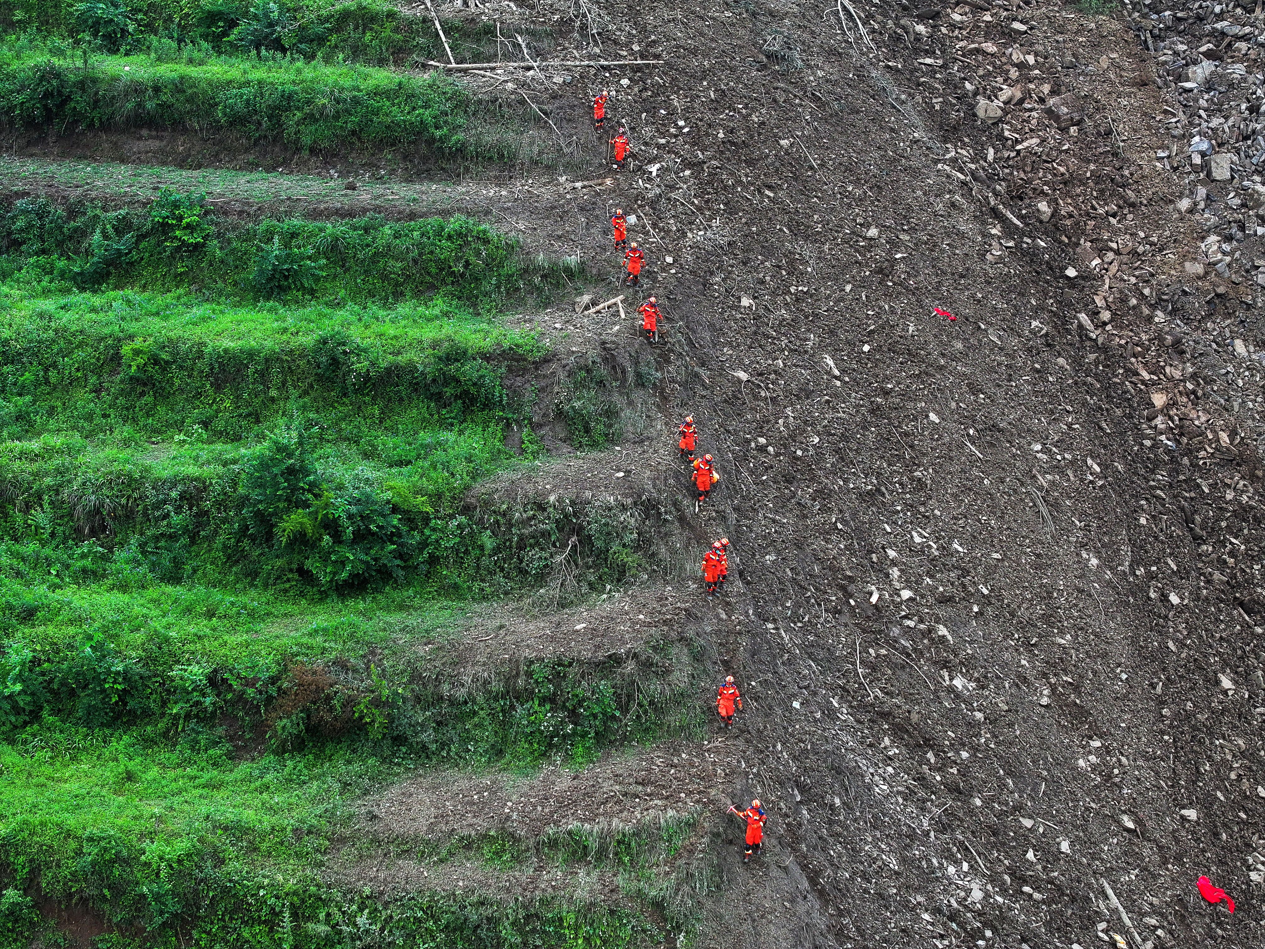 Rescuers at work following a landslide in Qingyang, in Dafang County of Bijie City, southwest China's Guizhou Province, 22 May 2025. A landslide struck Guowa township trapping 19 persons, two bodies having retrieved so far. (Photo by Yang Wenbin/Xinhua News Agency)
