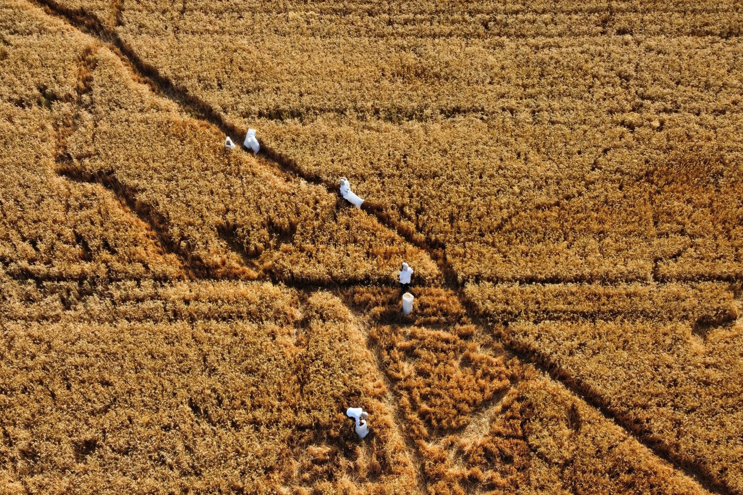 Ultra-Orthodox Jews harvest wheat in a field outside the city of Modiin, Israel, 11 May 2025. The harvested wheat will be stored for almost a year and then used to grind flour to make unleavened bread or Matzah in Hebrew for the week-long Passover Holiday. (Photo by Abir Sultan/EPA)