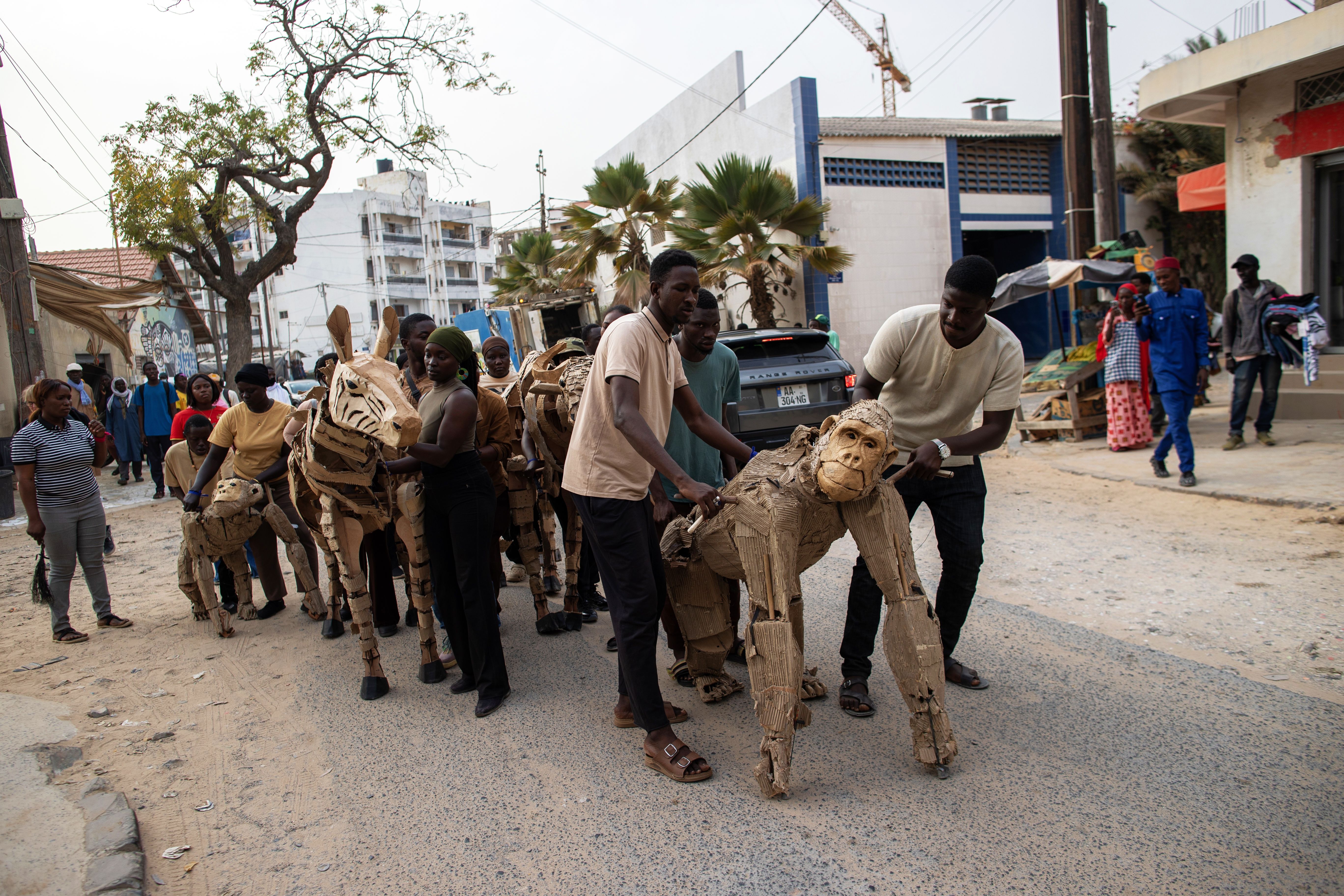 Puppeteers work with “The Herds”, animated life-size animals puppets made of recycled materials, in Dakar, Senegal, 25 April 2025. (Photo by Jerome Favre/EPA/EFE)