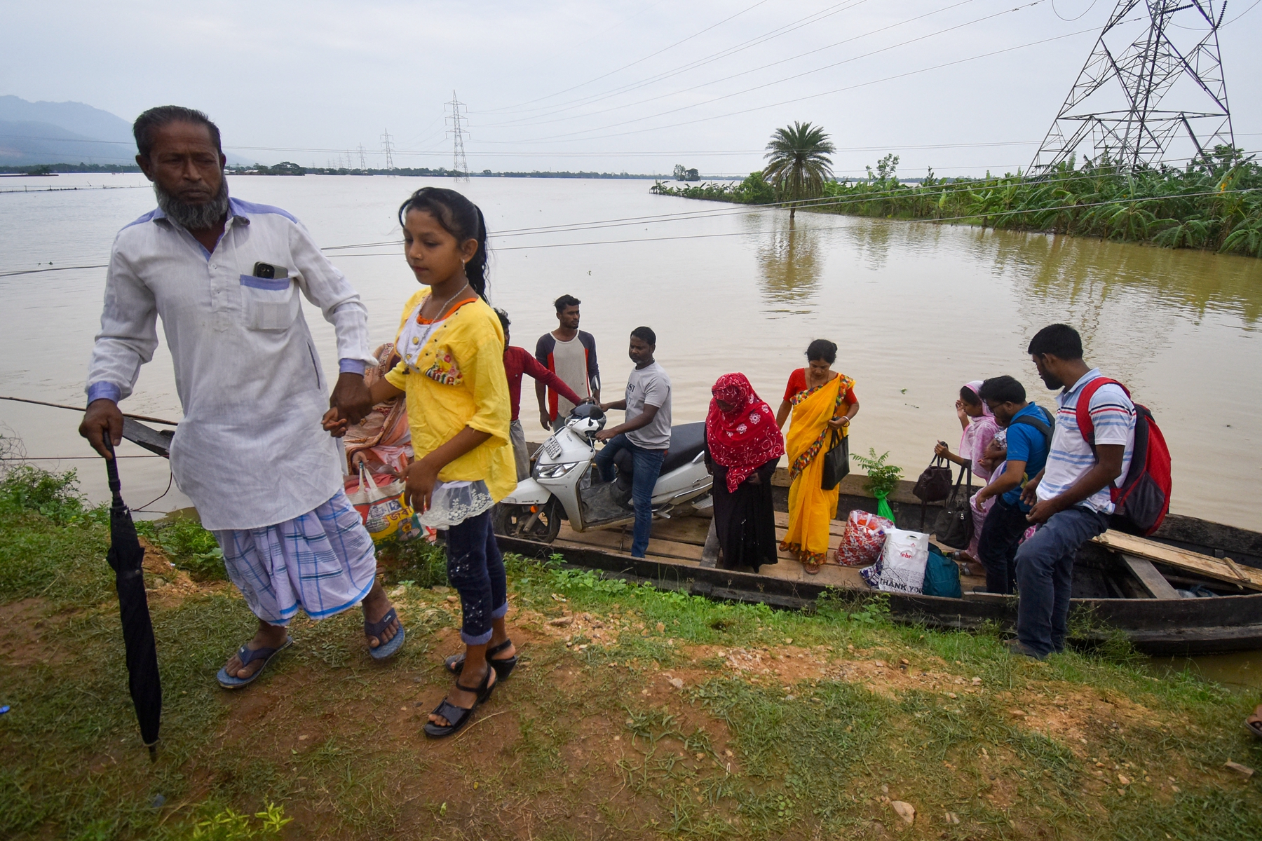 Women and children step off a wooden boat onto a grassy riverbank in Hojai district, Assam, India, on June 3, 2025. (Photo by Anuwar Hazarika/Middle East Images via AFP Photo)