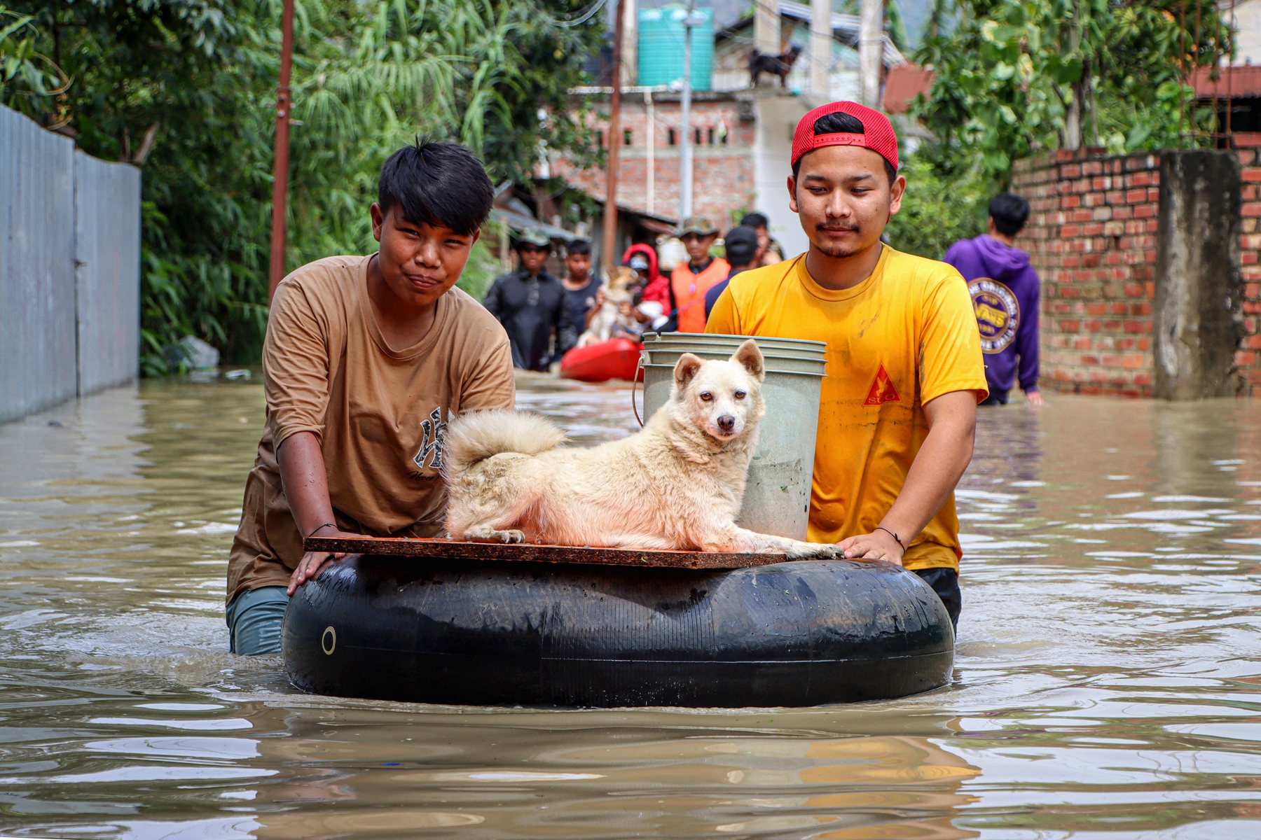 Men carry a dog on an inflated tube as they wade through floodwaters at Kongba in Imphal East on June 3, 2025. Flash floods and landslides after torrential monsoon rain over the last two days killed at least 30 people in India's northeast, officials said on June 1. (Photo by AFP Photo/Stringer)
