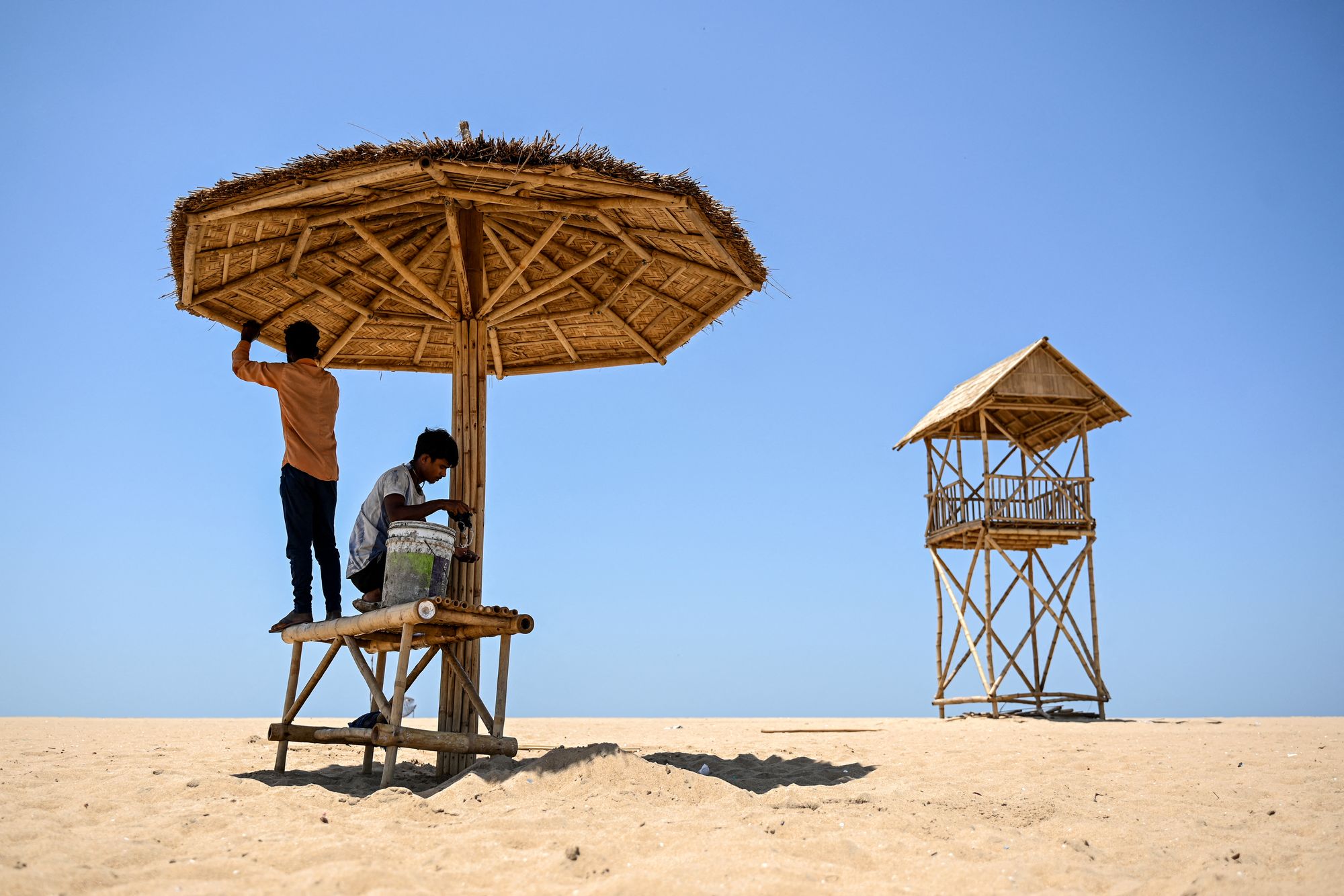 Workers install temporary shelter for shade at Marina Beach on a hot summer day in Chennai on June 4, 2025. (Photo by R. Satish Babu/AFP Photo)
