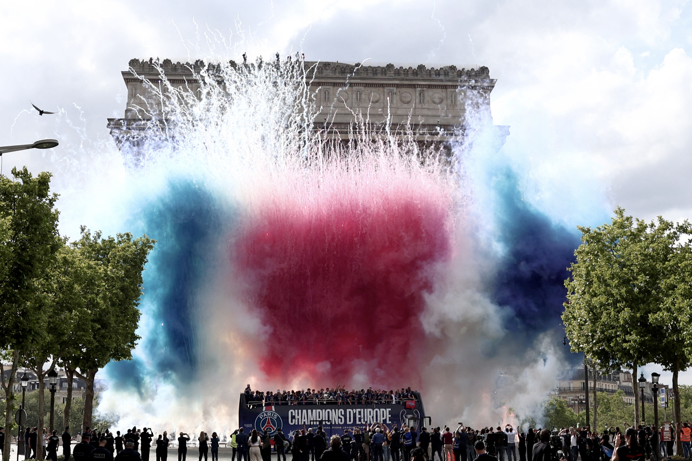 Fireworks explode as the PSG team bus parades in front of the Arc de Triomphe in Paris on June 1, 2025, a day after PSG won the 2025 UEFA Champions League final football match against Inter Milan in Munich. (Photo by Thibaud Moritz/AFP Photo)