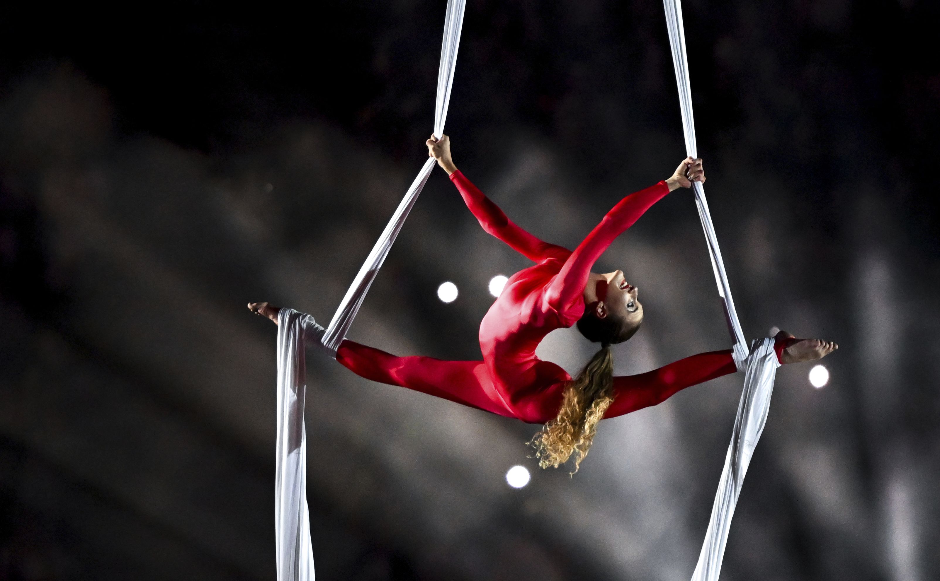 A performer participants in the stadium gala at the International German Gymnastics Festival in the Red Bull Arena in Leipzig, Germany, Saturday, May 31, 2025. (Photo by Hendrik Schmidt/dpa via AP Photo)