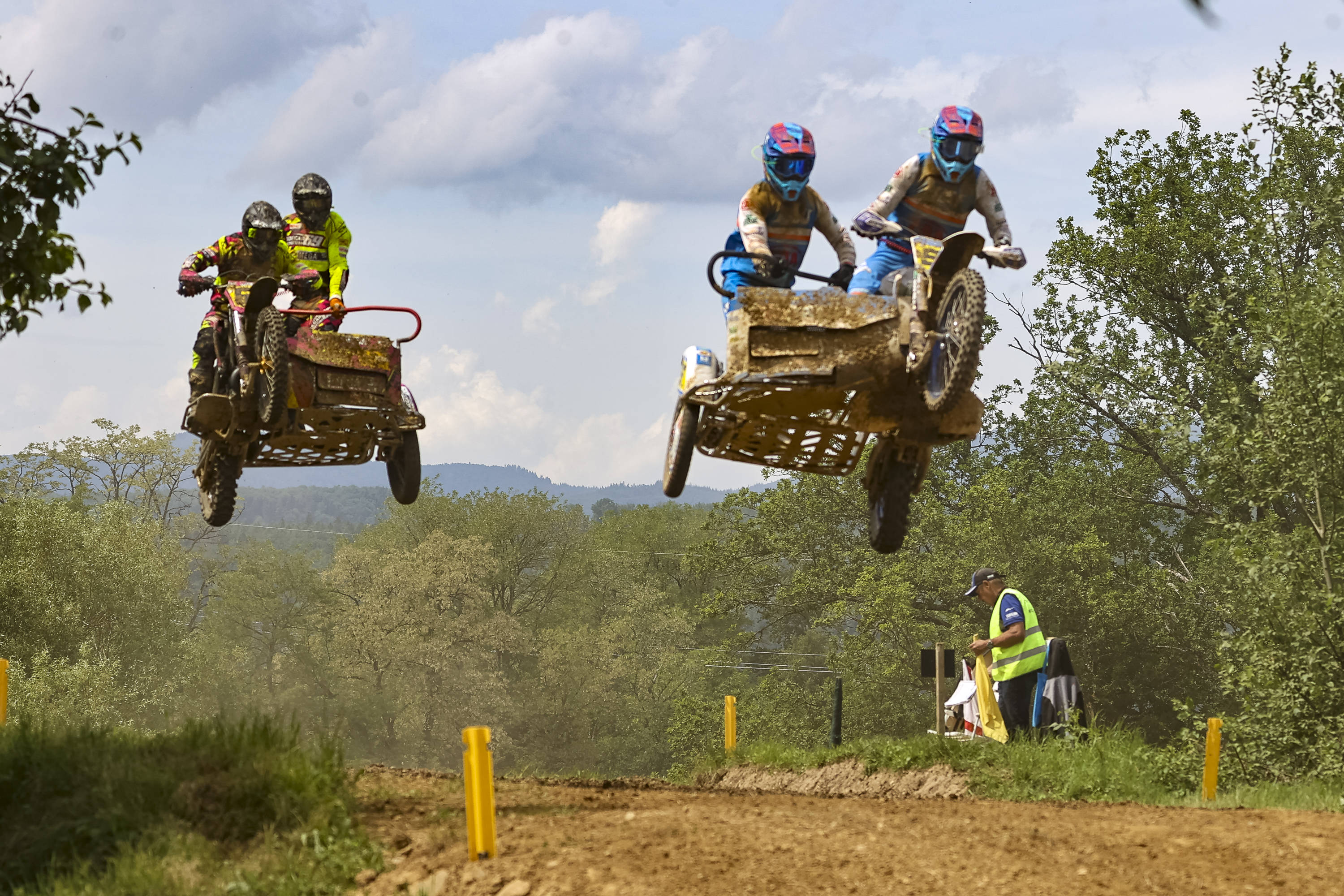 Nick Uhlig and Philipp Oettel race alongside Lukas Erlecke and Leon Freygang during the opening round of the German sidecar championship at the 58th ADAC Motocross in Schopfheim, Deutschland on June 1, 2025. (Photo by Grant Hubbs/IMAGO via Avalon)