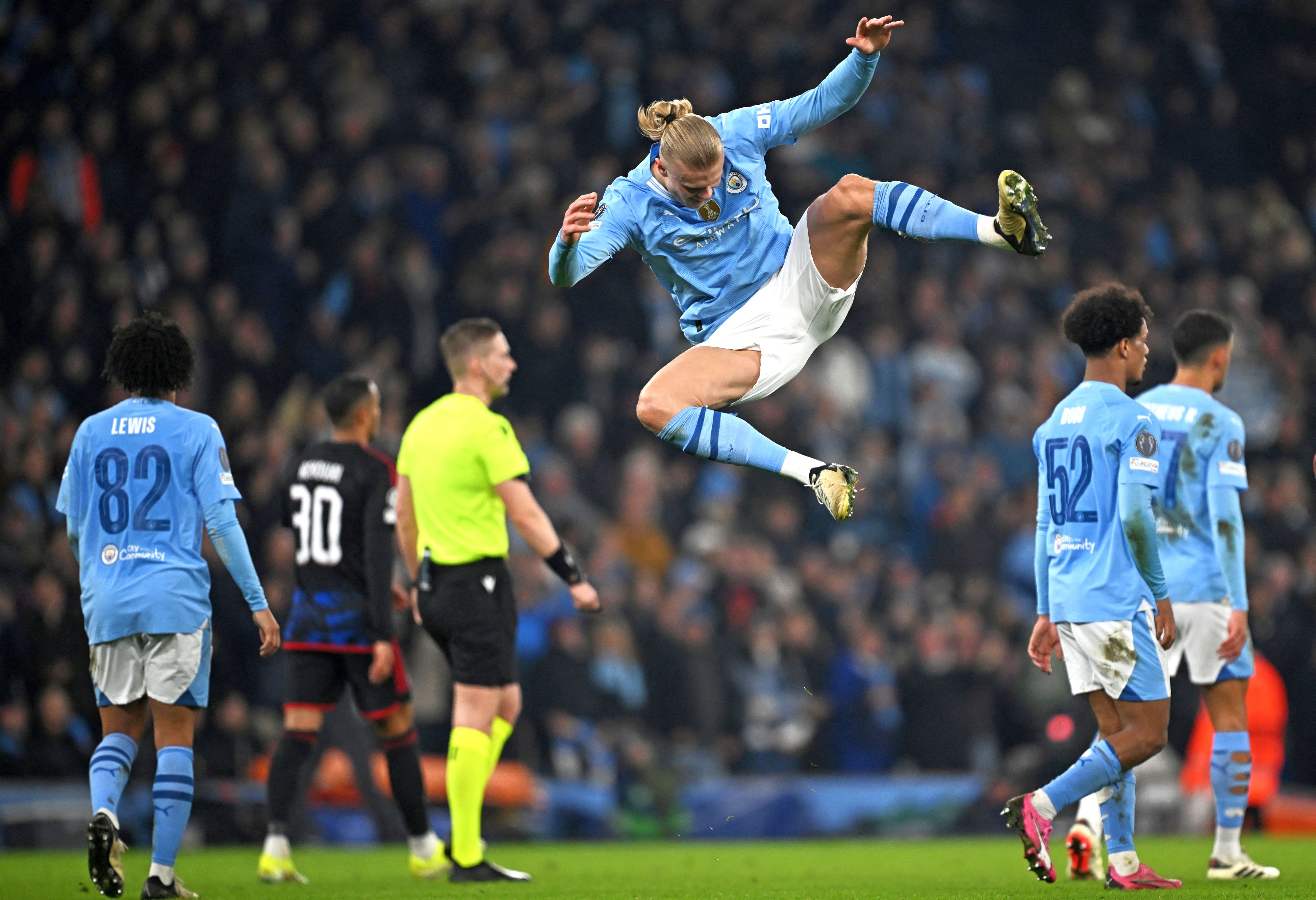 Manchester City's Norwegian striker #09 Erling Haaland (C) celebrates after scoring their third goal during the UEFA Champions League round of 16, second-leg, football match between Manchester City and FC Copenhagen at the Etihad Stadium, in Manchester, north west England, on March 6, 2024. (Photo by Paul Ellis/AFP Photo)