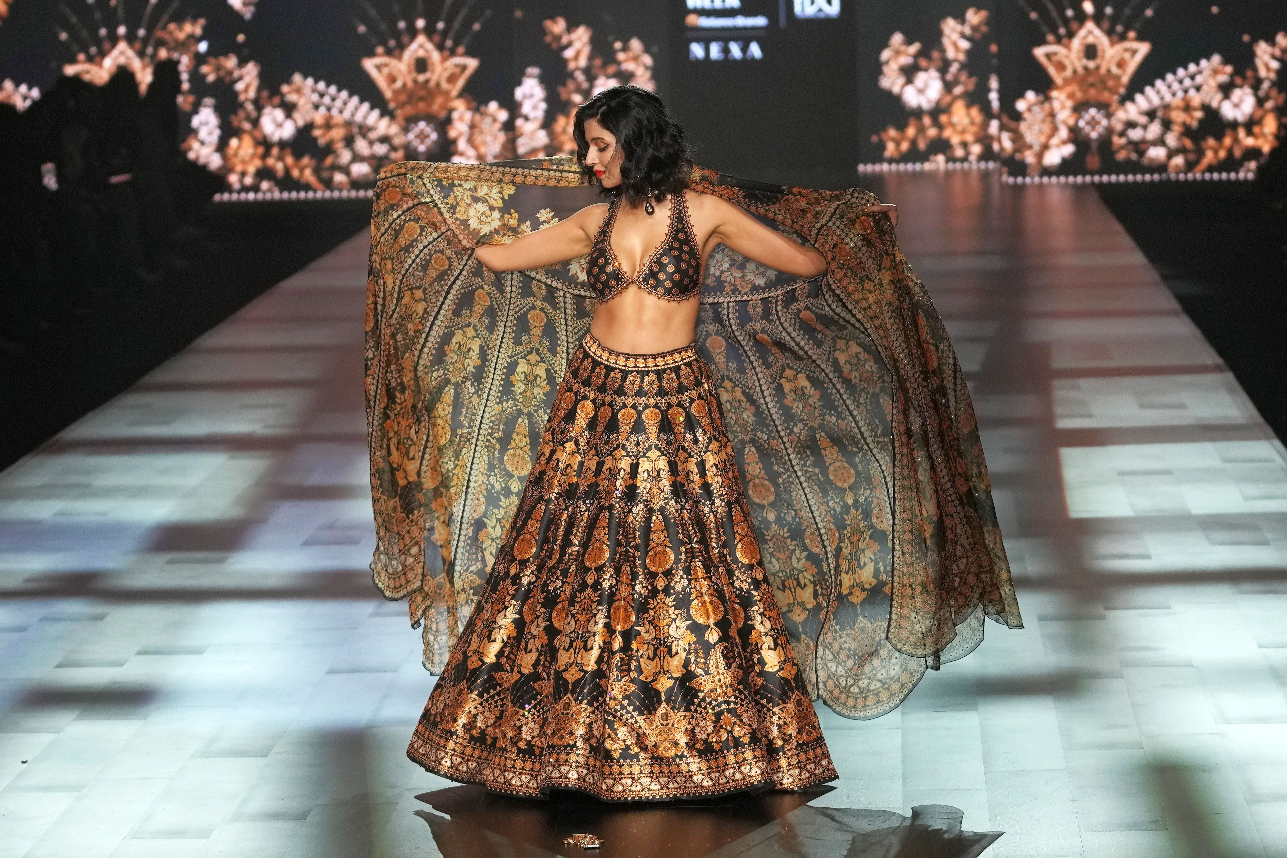 A model presents creations by Rajdeep Ranawat during the Fashion Design Council of India (FDCI) Lakme Fashion Week (LFW) in Mumbai, India, Friday, March 15, 2024. (Photo by Rajanish Kakade/AP Photo)