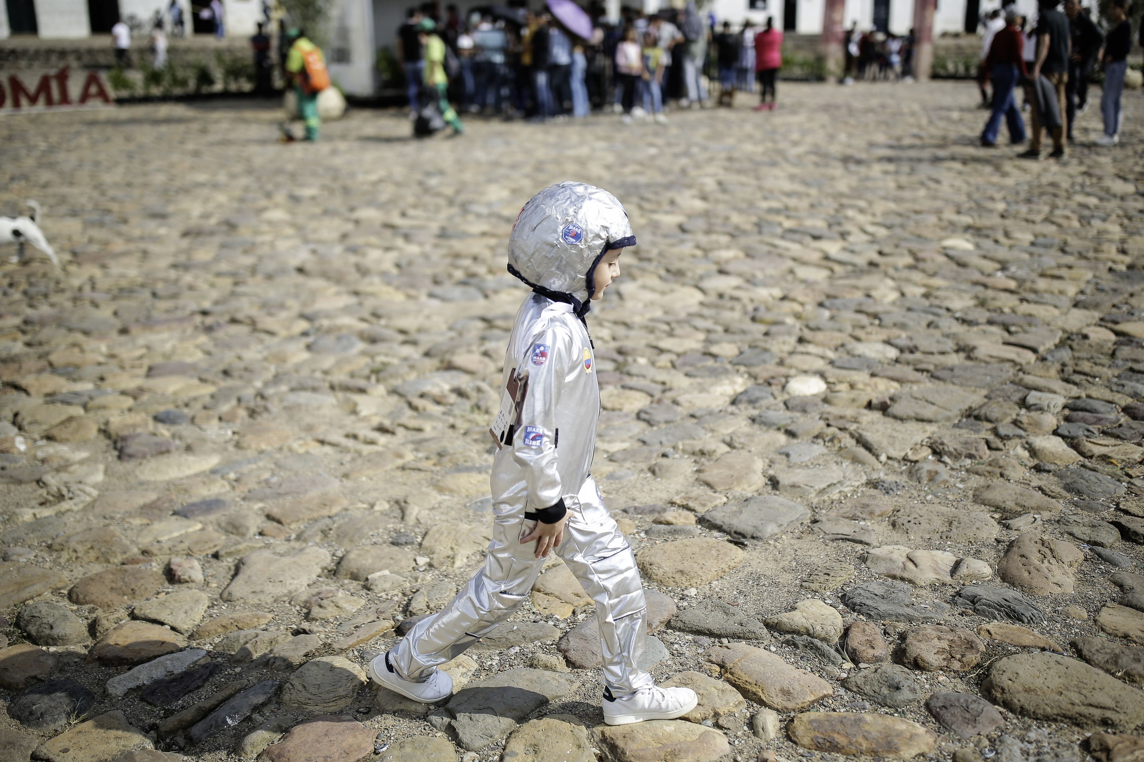 A boy dressed as an astronaut takes part in the XXVII Astronomy Festival that brings together astronomy professionals and enthusiasts to share knowledge about the universe in Villa de Leyva, Colombia, on March 17, 2024. The XXVII version of the Astronomy Festival was held in the municipality of Villa de Leyva, in the department of Boyacá, with China as the guest country. (Photo by Jhon Paz/AFP Photo)