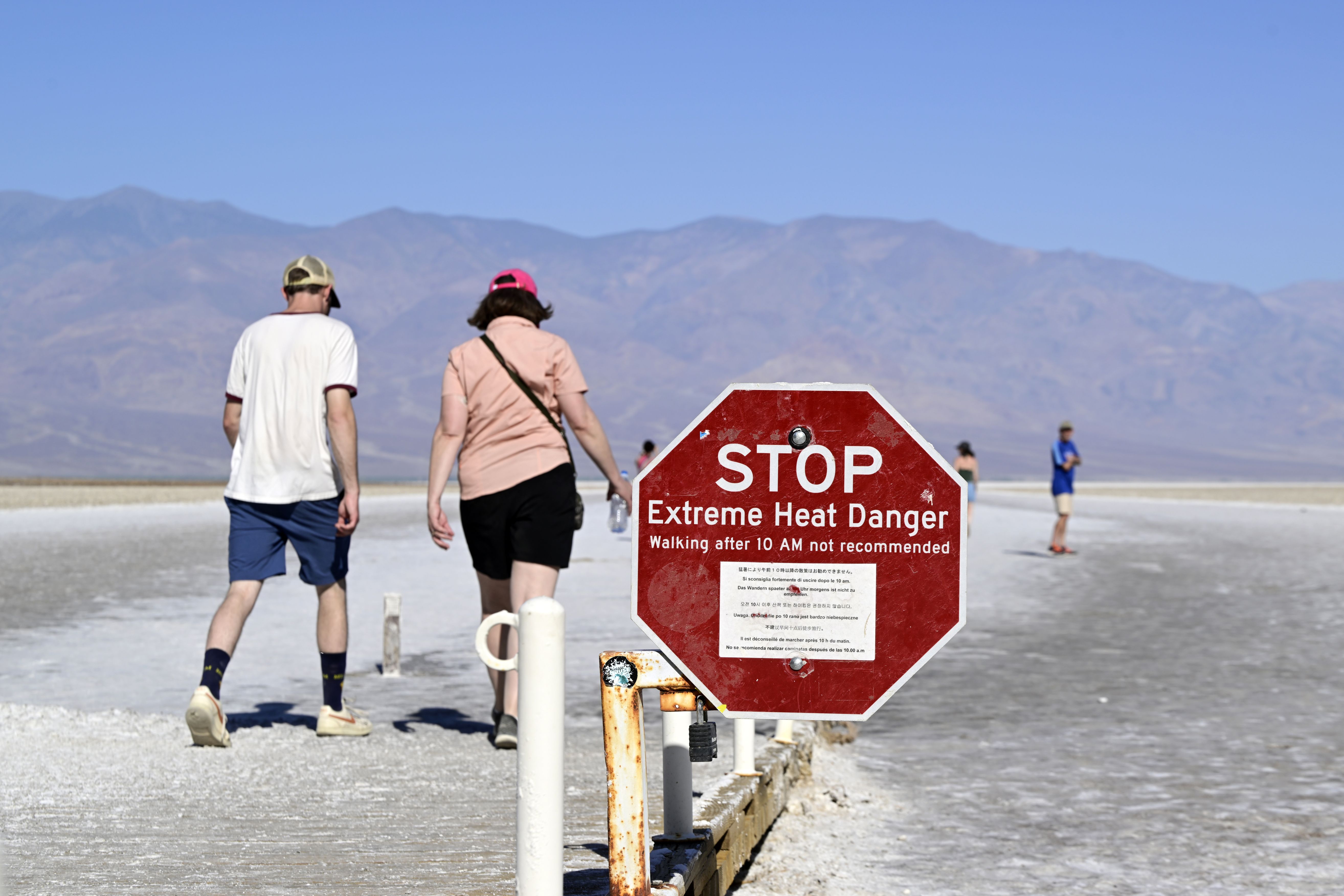 Tourists visit Badwater Basin as “Extreme Heat Warning” issued in Death Valley National Park of California, United States on May 29, 2025. Badwater Basin is the lowest point in North America, with an elevation of 282 feet (86 meters) below sea level. The basin is a salt-flat depression surrounded by mountains, and its name comes from the saltwater springs and pools that exist within the area. (Photo by Tayfun Coskun/Anadolu via Getty Images)