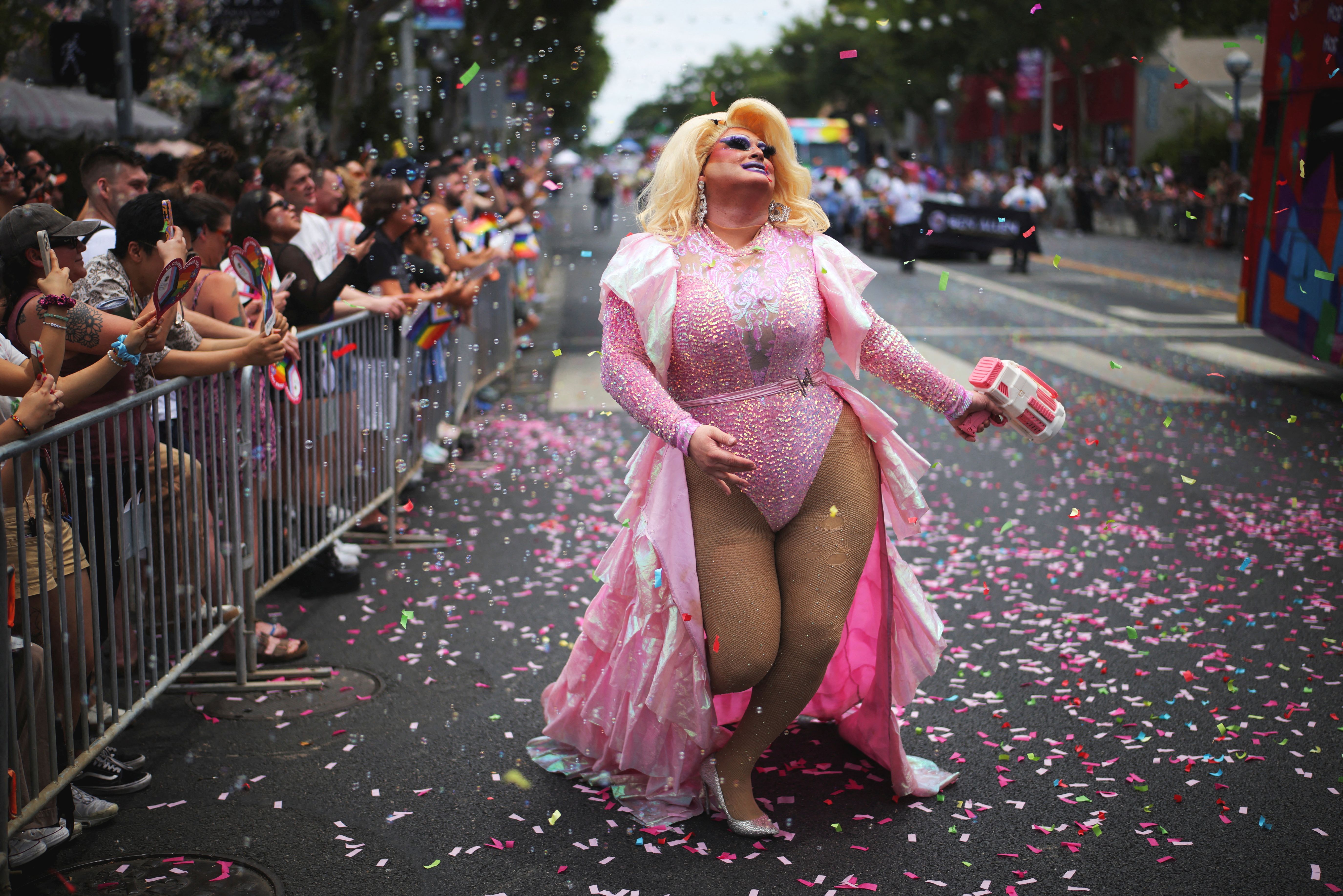 A participant walks during the annual Pride Parade in West Hollywood, California on June 1, 2025. (Photo by Daniel Cole/Reuters)
