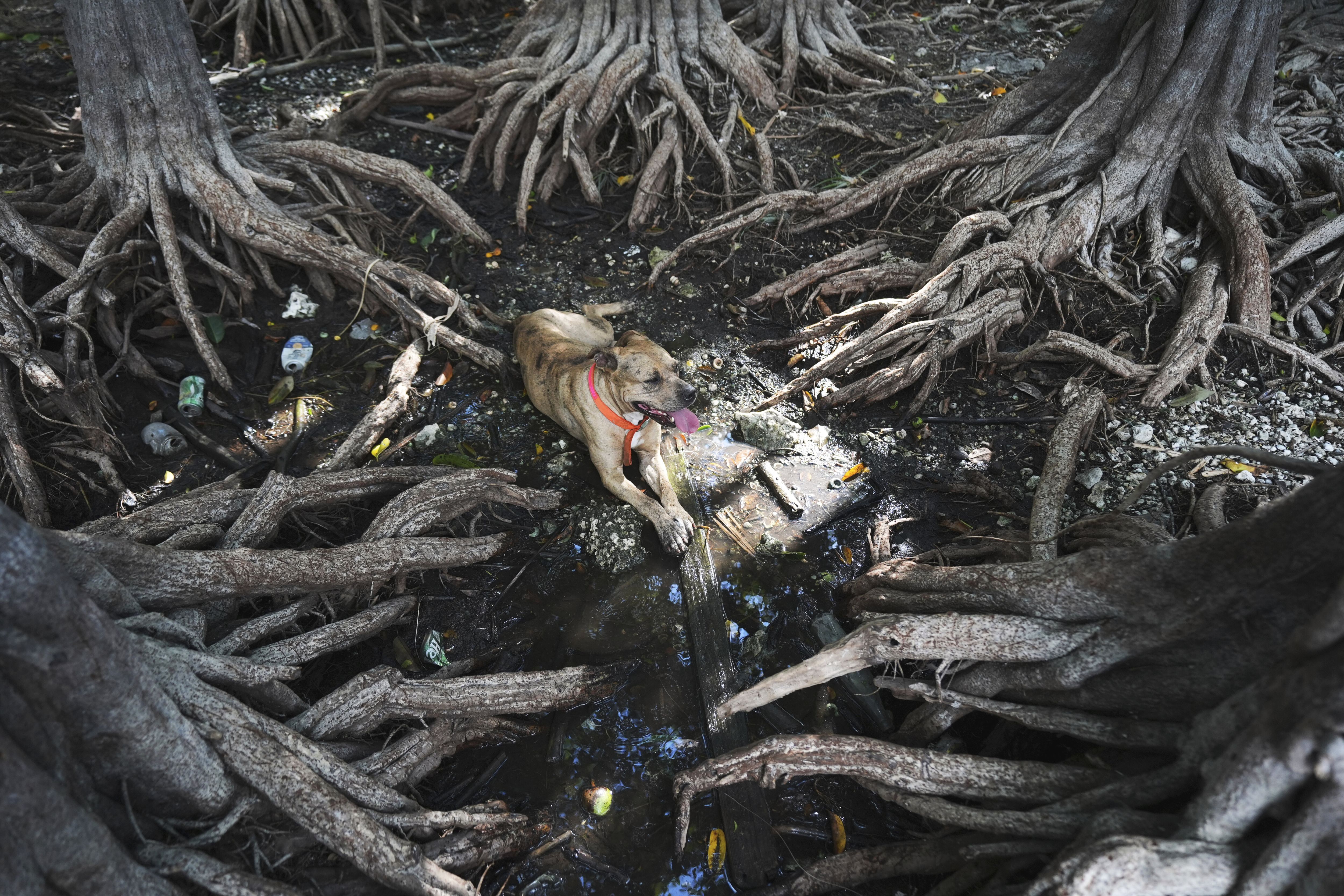 Marshall Jones' dog, Scooby, lies on a small patch of damp ground in a pond apple forest whose root system and previously submerged trash have been exposed by ongoing drought conditions, near Mack's Fish Camp, Jones' fifth-generation, family-owned airboat and tourism business, in the Florida Everglades near Miramar, Fla., Wednesday, May 28, 2025. (Photo by Rebecca Blackwell/AP Photo)