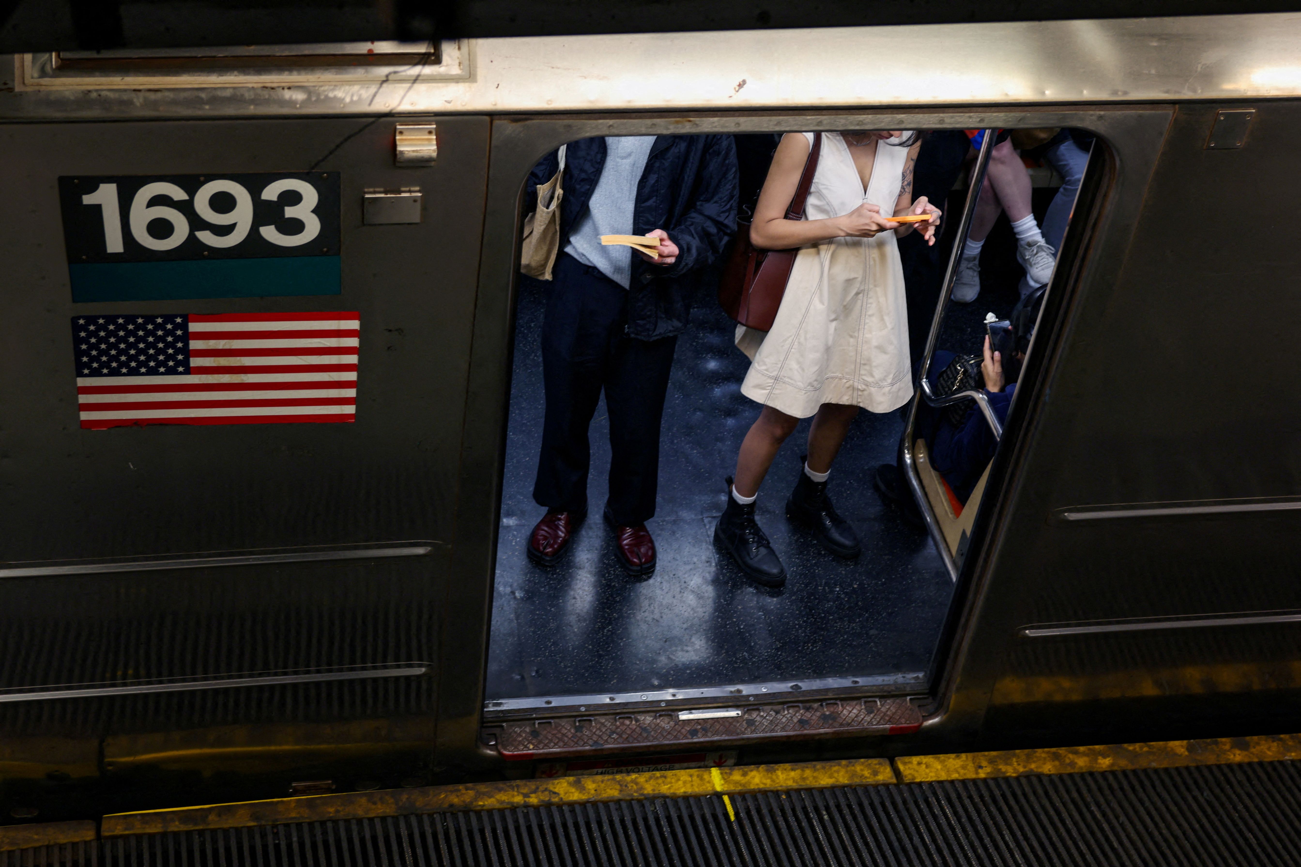 People wait for a subway train to depart Union Square station, in New York City on June 1, 2025. (Photo by Kevin Coombs/Reuters)