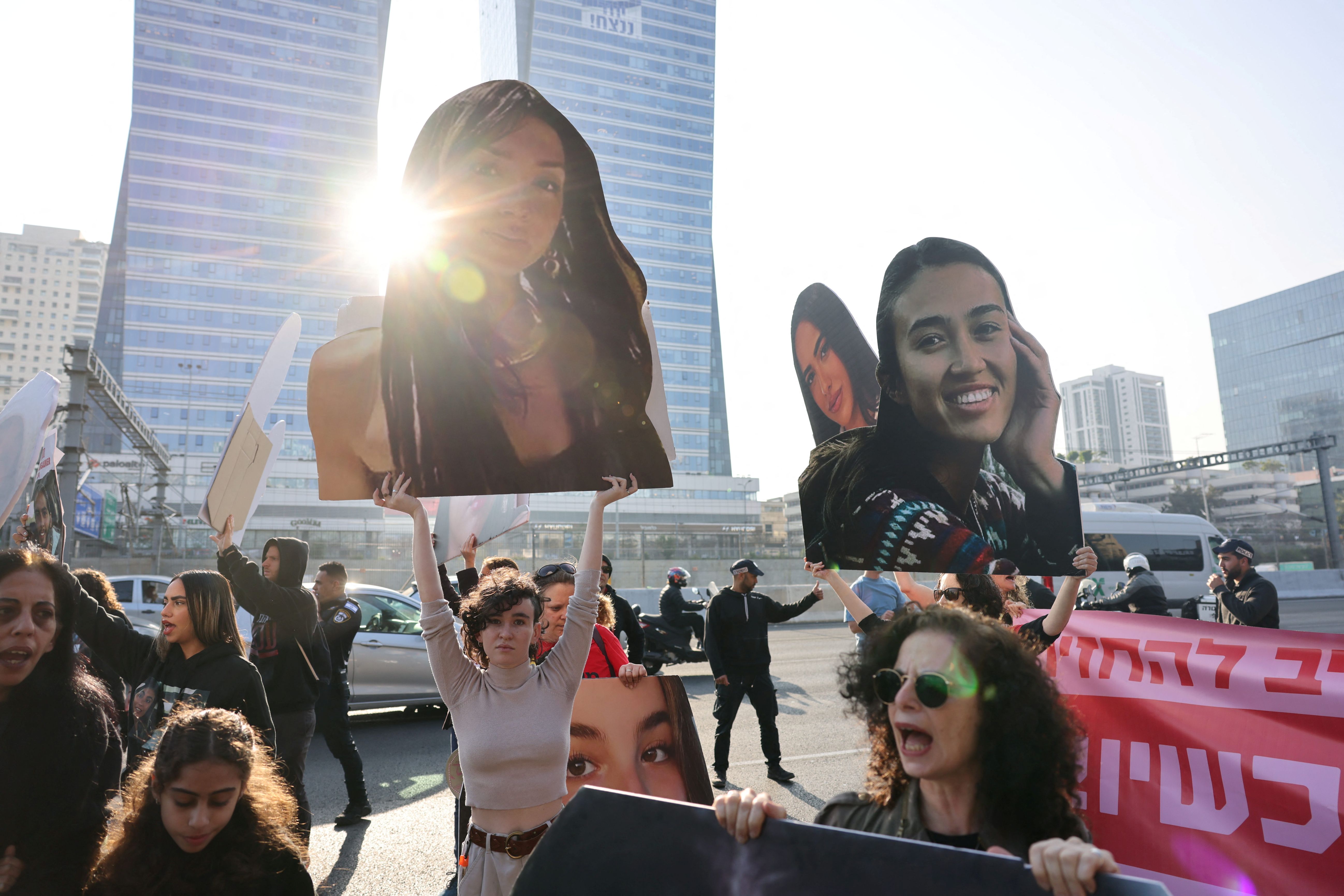 Demonstrators block the main highway as they hold signs with the faces of female hostages held in Gaza since October 7 and to call for their immediate release, amid the ongoing conflict between Israel and Palestinian Islamist group Hamas, in Tel Aviv, Israel on March 14, 2024. (Photo by Tomer Appelbaum/Reuters)