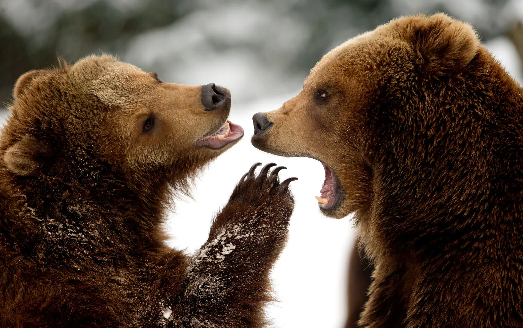 Two brown bears play in the snow on March 18, 2013 at the Tierpark Hagenbeck Zoo in Hamburg, northern Germany. Temperatures in the Hanseatic city were around the freezing point. (Photo by Sven Hoppe/AFP Photo)