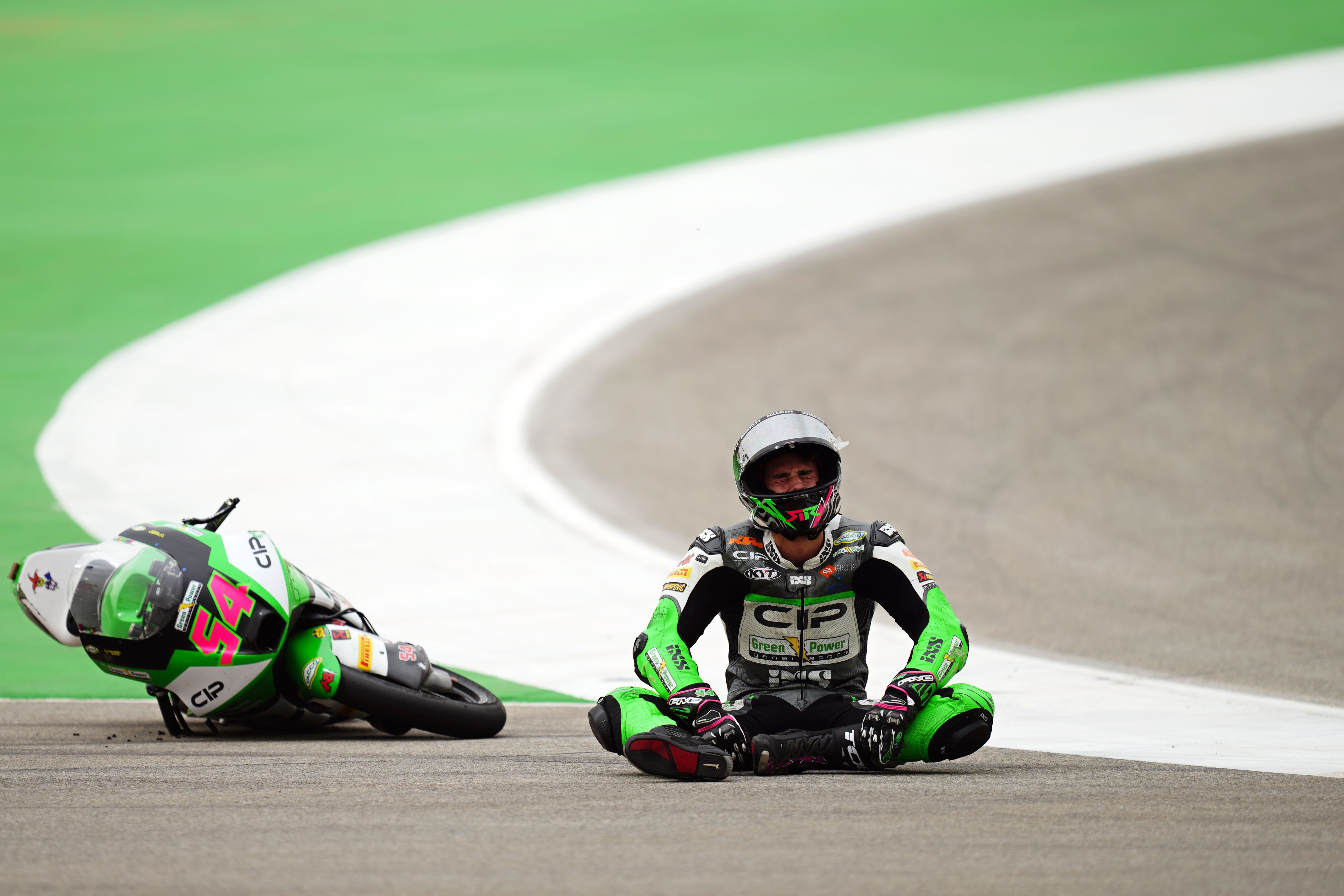 Moto3 rider Riccardo Rossi of Italy reacts after crashing during the Portuguese Motorcycle Grand Prix at the Algarve International circuit near Portimao, Portugal, Sunday, March 24, 2024. (Photo by Jose Breton/AP Photo)