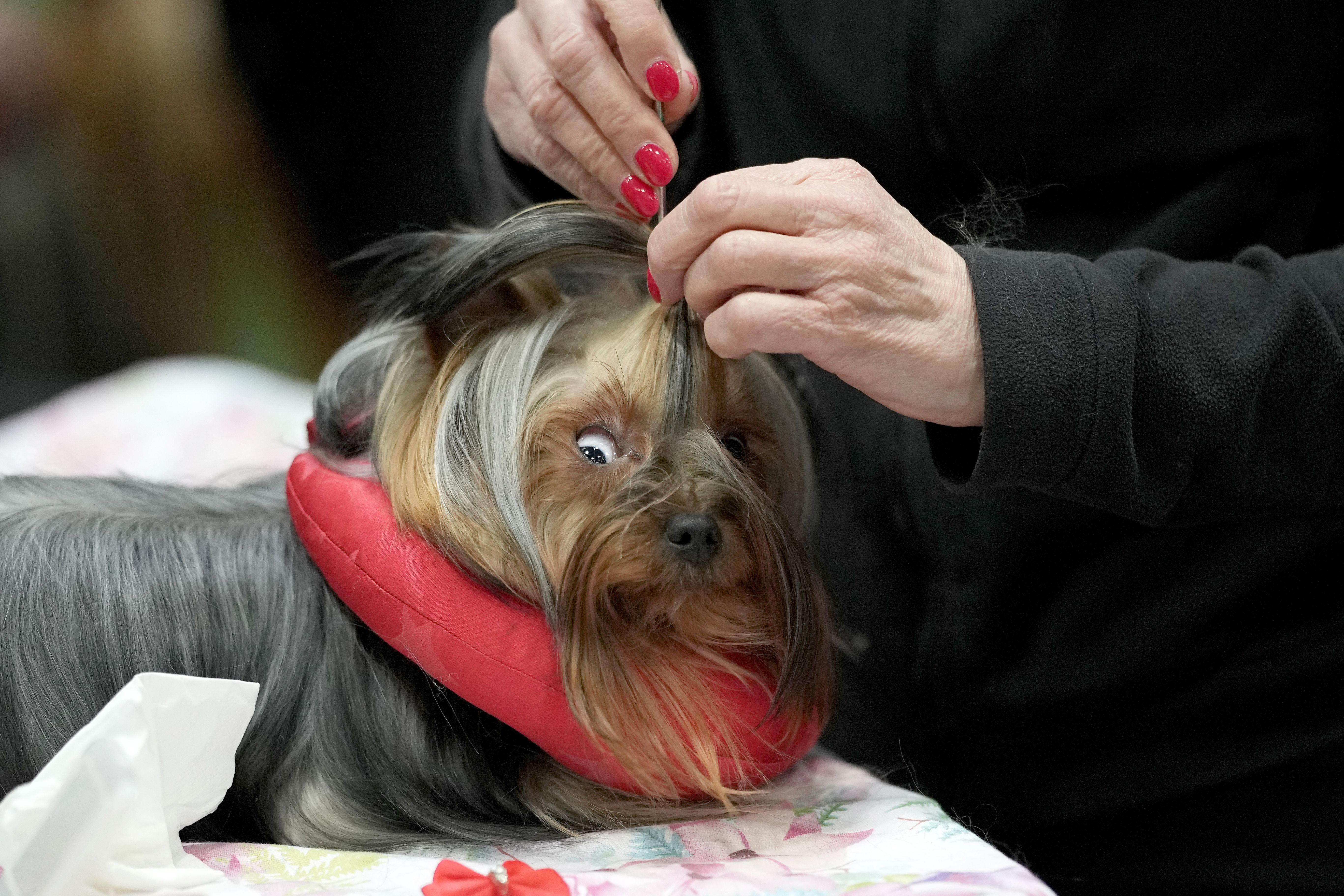 A Yorkshire terrier is grromed before entering the show ring during Crufts at the National Exhibition Centre on March 07, 2024 in Birmingham, England. Over 24,000 dogs from 220 different breeds take part in Crufts 2024 with hundreds of the most agile and athletic dogs competing in different competitions including agility and flyball and, new for this year, Hoopers - a low-impact and inclusive activity for dogs and owners. The event culminates in the Best in Show 2024 trophy, awarded on Sunday night. (Photo by Christopher Furlong/Getty Images)