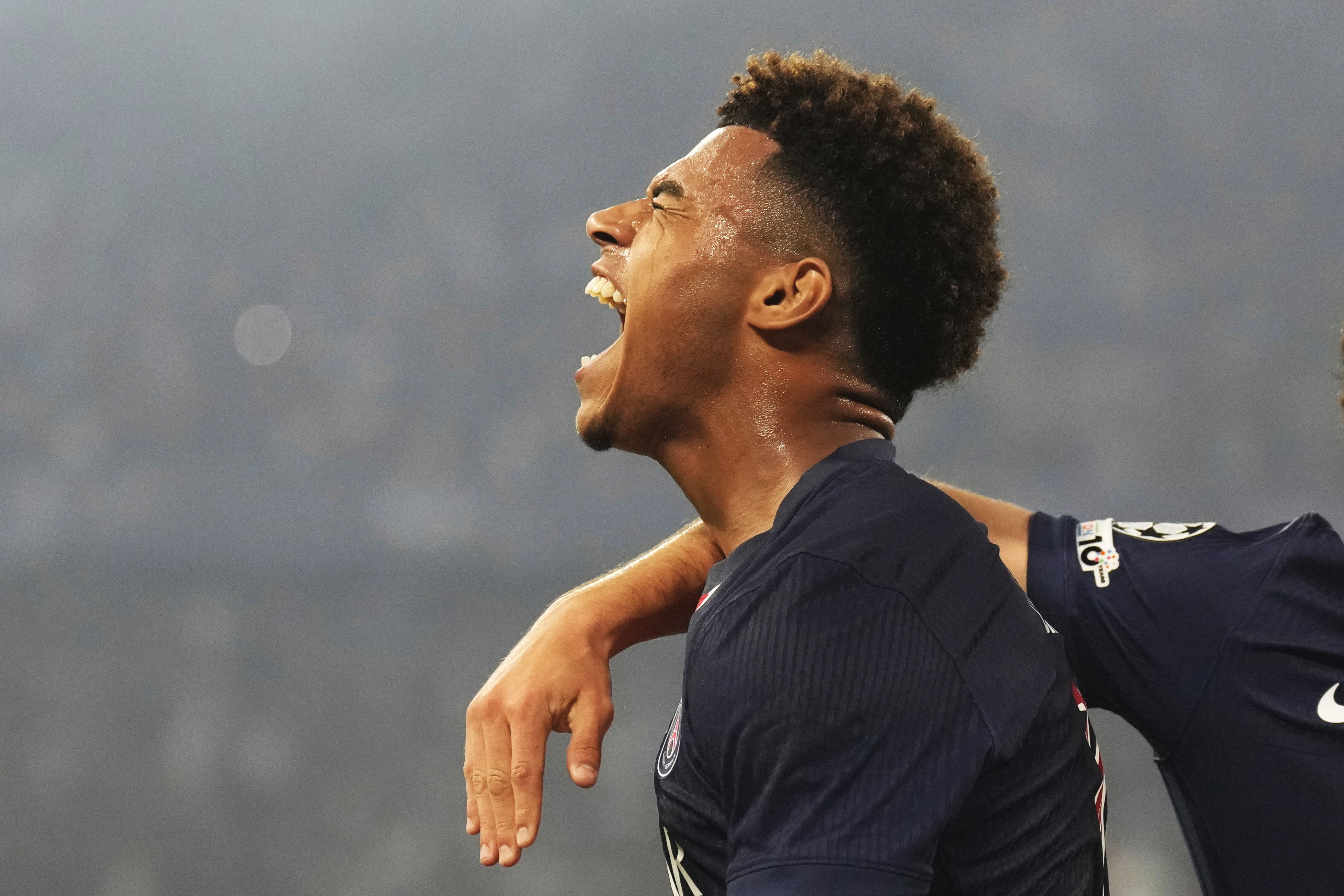 PSG's Desire Doue celebrates after scoring his side's second goal during the Champions League final soccer match between Paris Saint-Germain and Inter Milan at the Allianz Arena in Munich, Germany, Saturday, May 31, 2025. (Photo by Matthias Schrader/AP Photo)