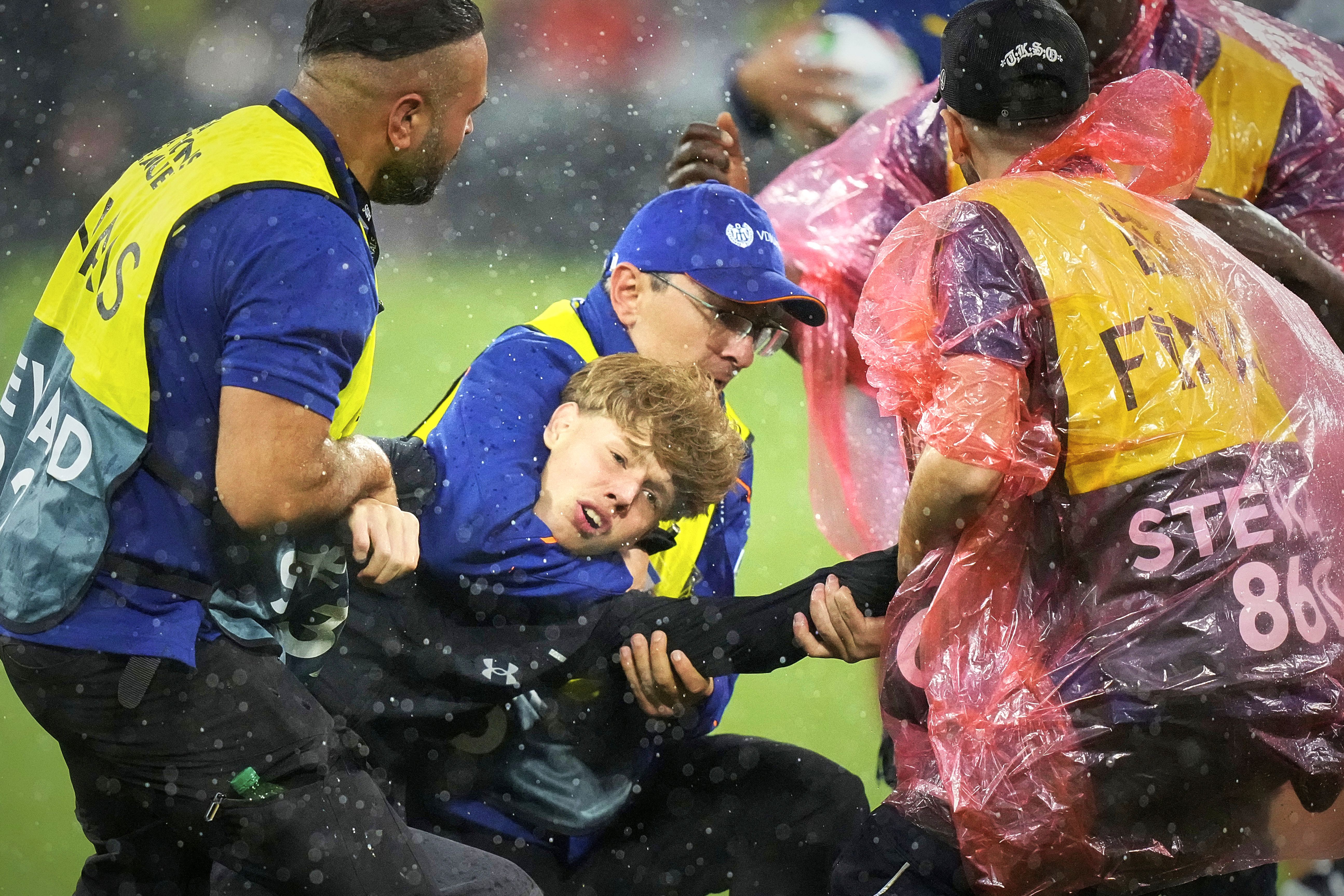 Stewards restrain a young man who entered the pitch attempting to get a selfie with Portugal's Cristiano Ronaldo before the Nations League semifinal soccer match between Portugal and Germany at the Munich Football Arena, in Munich, Germany, Wednesday, June 4, 2025. (Photo by Matthias Schrader/AP Photo)