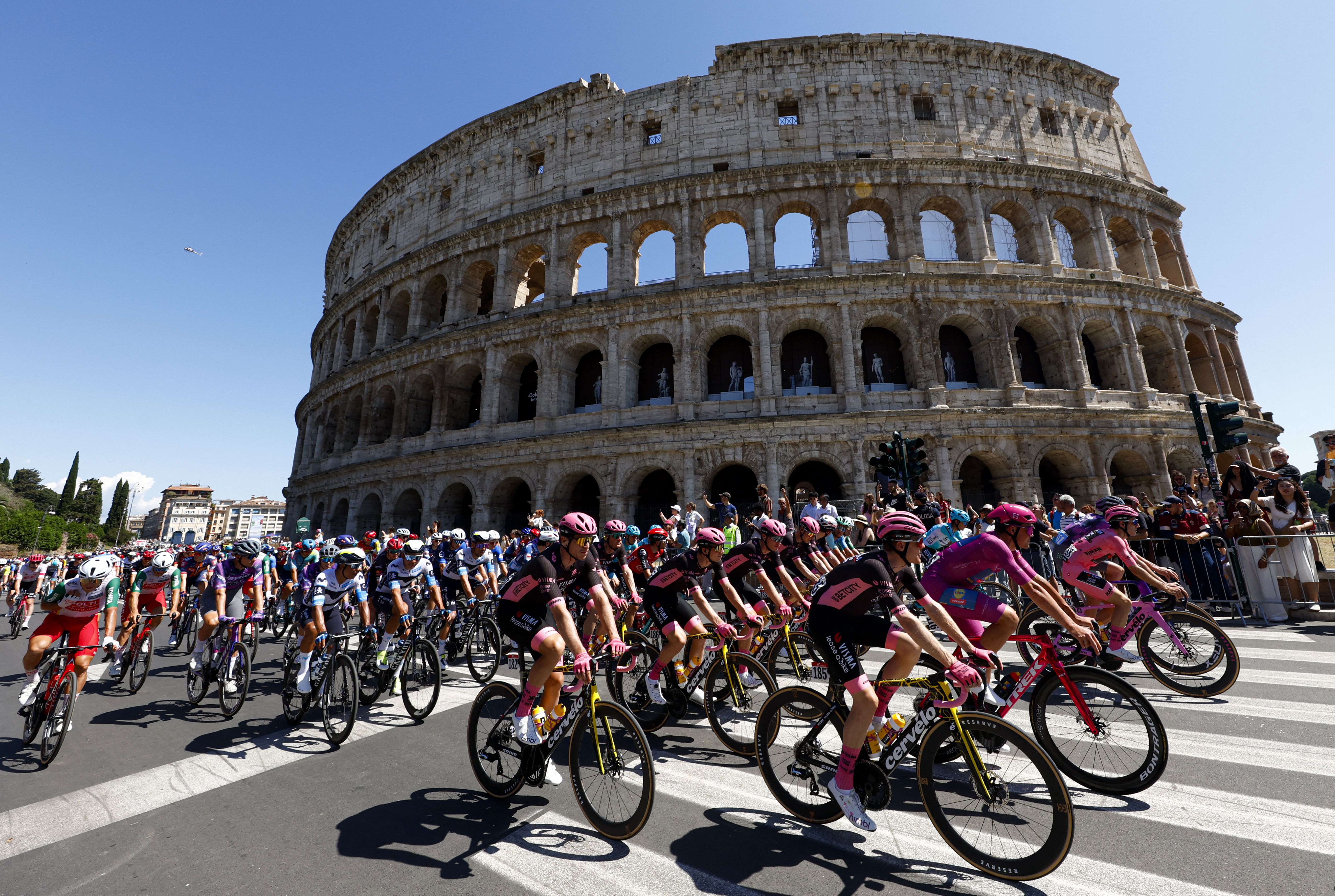 The peloton rides past the Colosseum during the 21st stage of the 108th Giro d'Italia cycling race of 143kms from Rome to Rome on June 1, 2025. (Photo by Luca Bettini/AFP Photo)