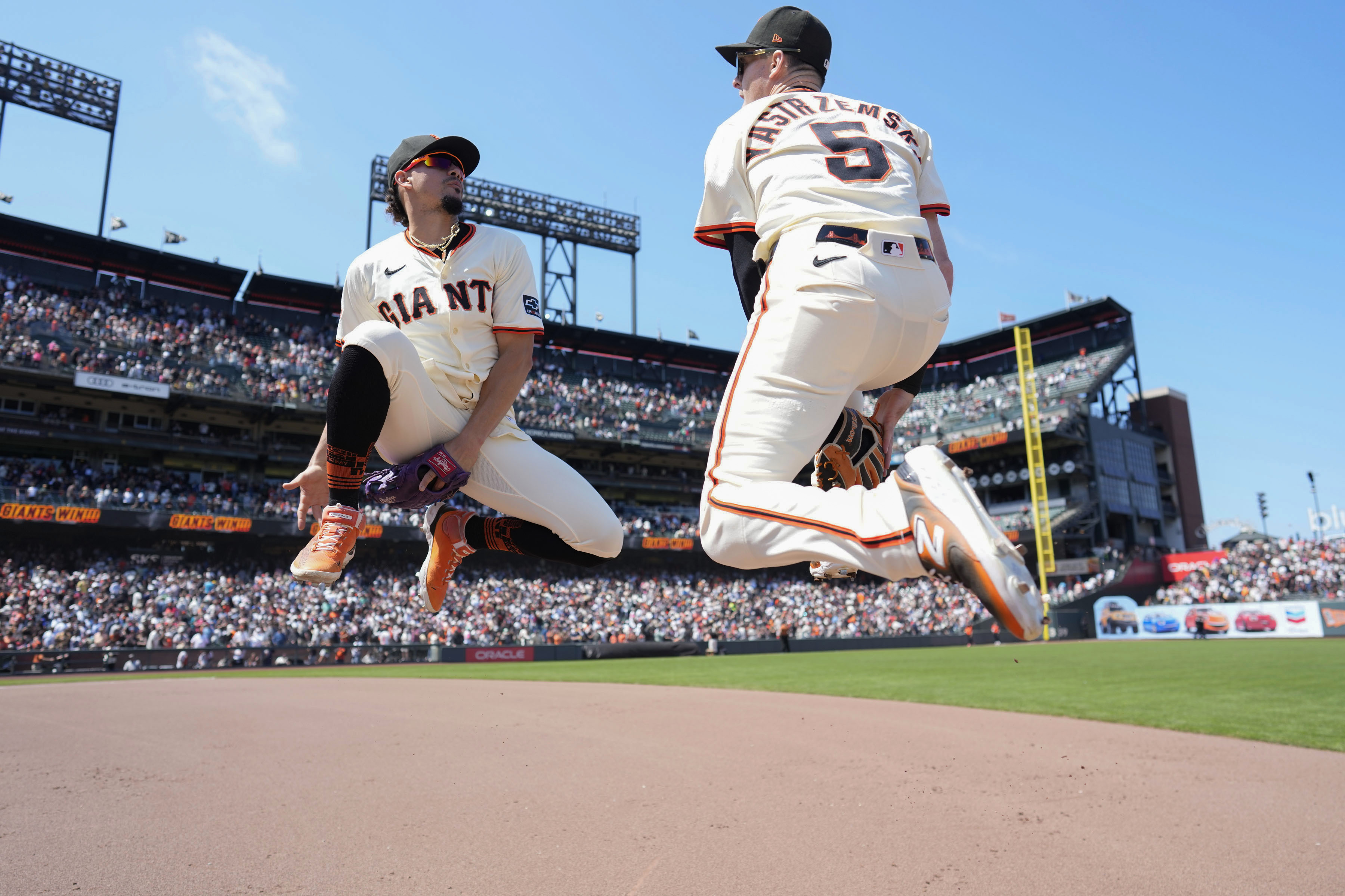 Willy Adames #2 and Mike Yastrzemski #5 of the San Francisco Giants high five after the game against the San Diego Padres at Oracle Park on June 5, 2025 in San Francisco, California. (Photo by Suzanna Mitchell/San Francisco Giants/Getty Images)