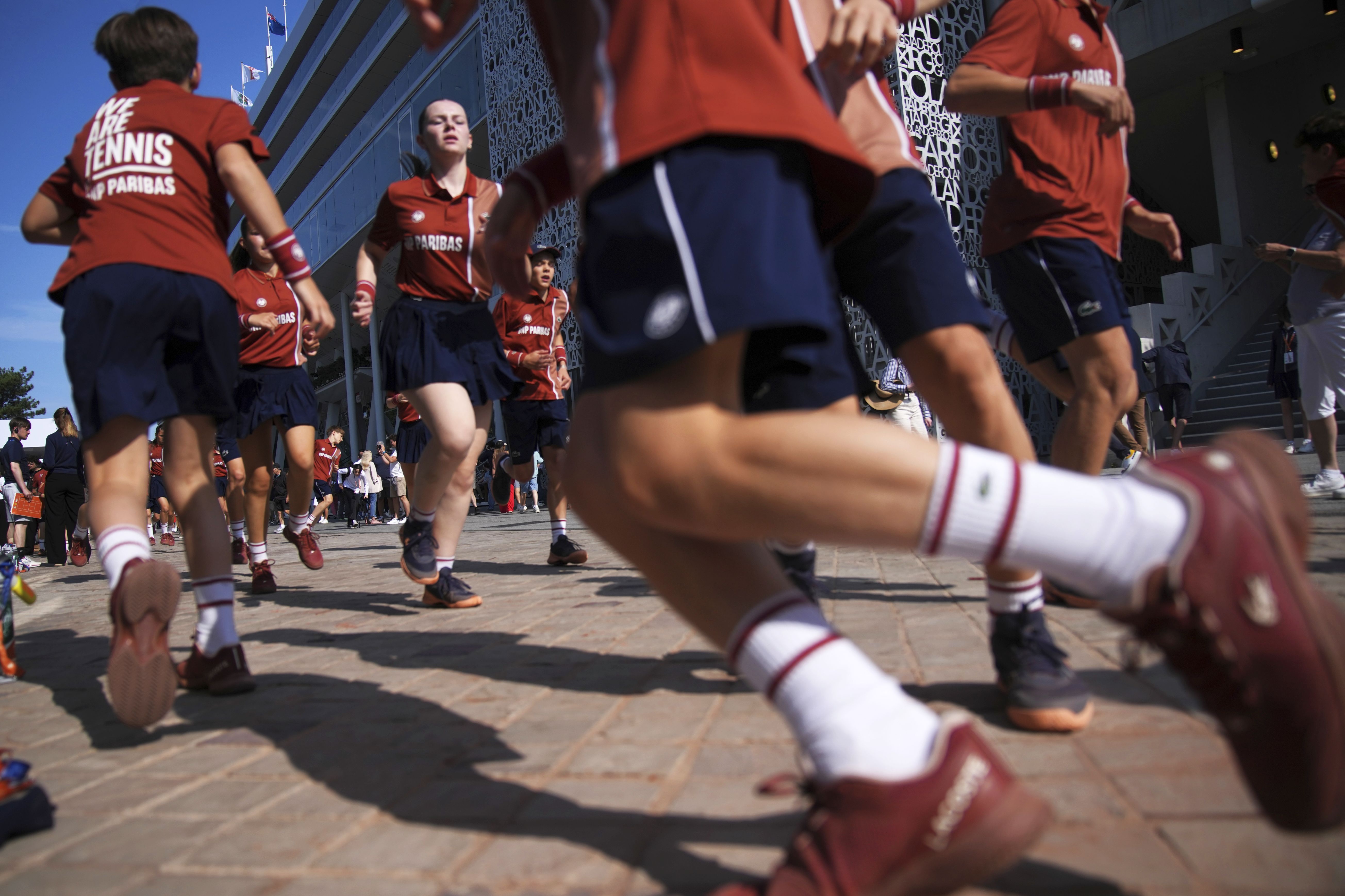 Ball boys and girls warm up for the French Tennis Open at the Roland-Garros stadium in Paris, Tuesday, June 3, 2025. (Photo by Christophe Ena/AP Photo)
