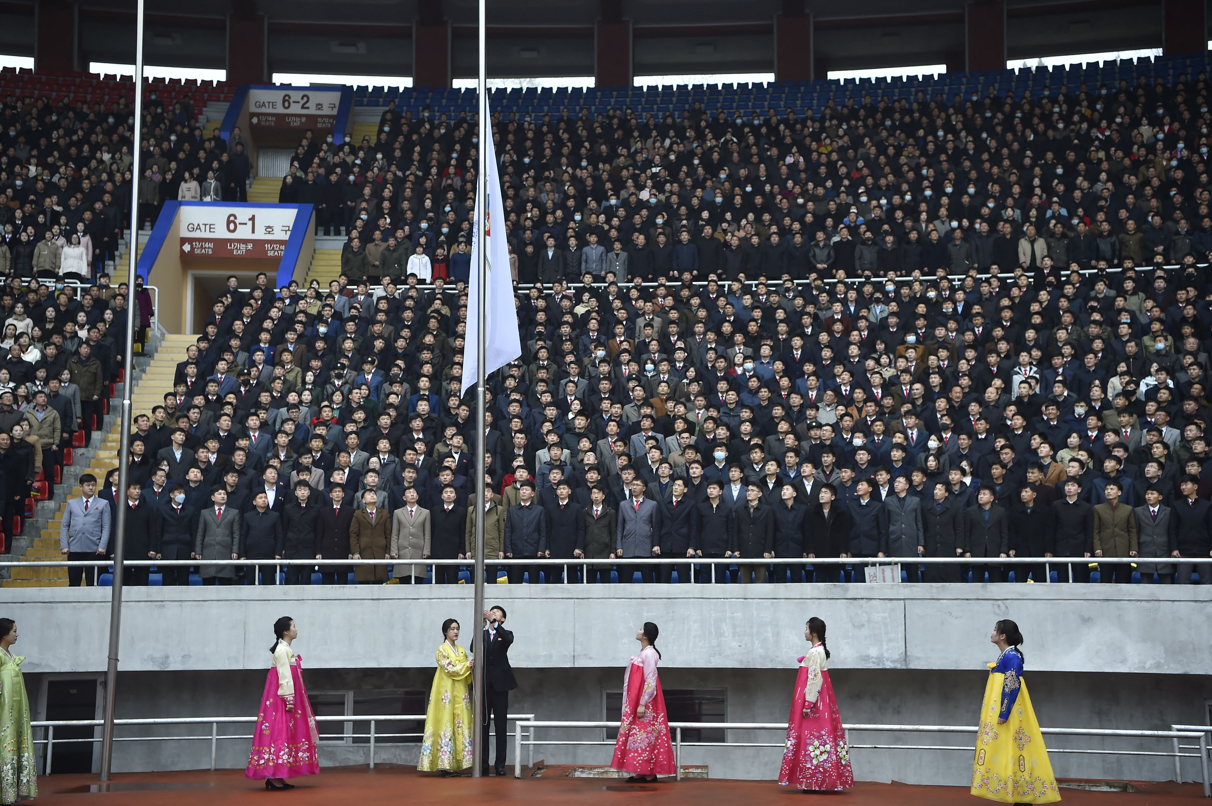 Spectators stand during a flag rising ceremony at the 31st Pyongyang International Marathon at Kim Il Sung Stadium in Pyongyang on April 6, 2025, as part of celebrations marking the birth of North Korea's founding leader Kim Il Sung in 1912. The last edition of the Pyongyang Marathon was held in 2019 before the pandemic, during which the nuclear-armed state sealed its borders in an effort to contain the virus. (Photo by Kim Won Jin/AFP Photo)