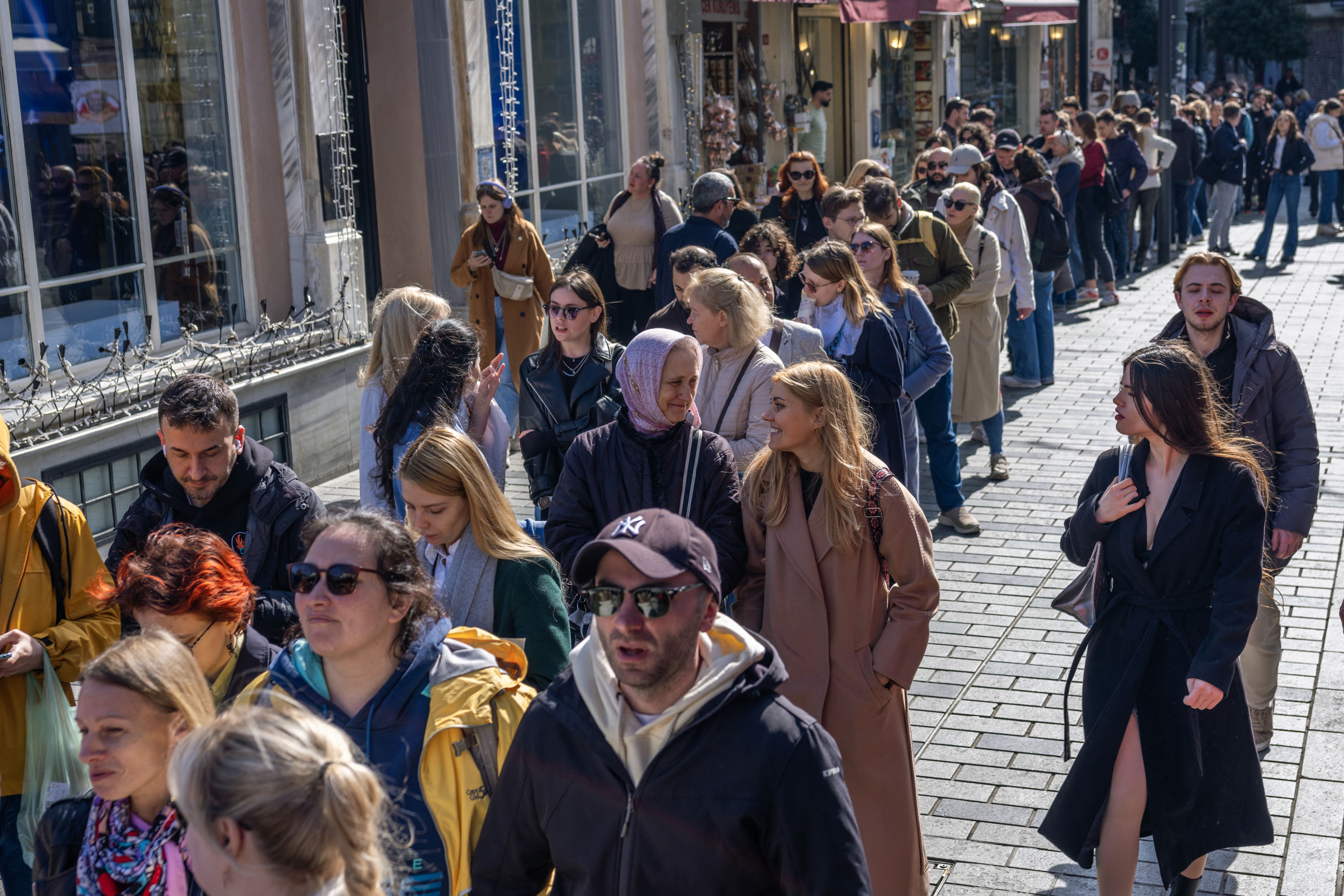 Russians queue to cast their votes in front of the Russian consulate at Istiklal Avenue in Istanbul on March 17, 2024, during Russia's presidential election. Russians vote on the final day of an election to extend Vladimir Putin's rule to three decades, as Ukraine launched fatal attacks on the border and some voters spoiled their ballots in protest. (Photo by Bulent Kilic/AFP)