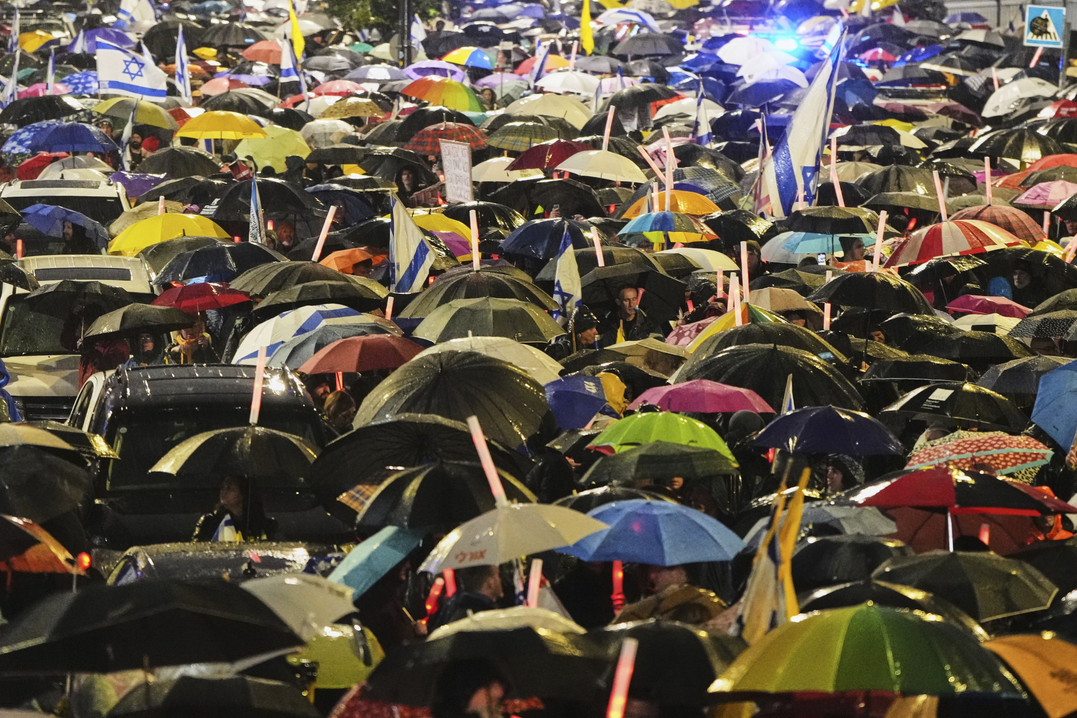 Israelis protest against Prime Minister Benjamin Netanyahu's plan to dismiss the head of the Shin Bet internal security service, and call for the release of hostages held by Hamas in the Gaza Strip, outside the Knesset, Israel's parliament in Jerusalem, on Thursday, March 20, 2025. (Photo by Ohad Zwigenberg/AP Photo)