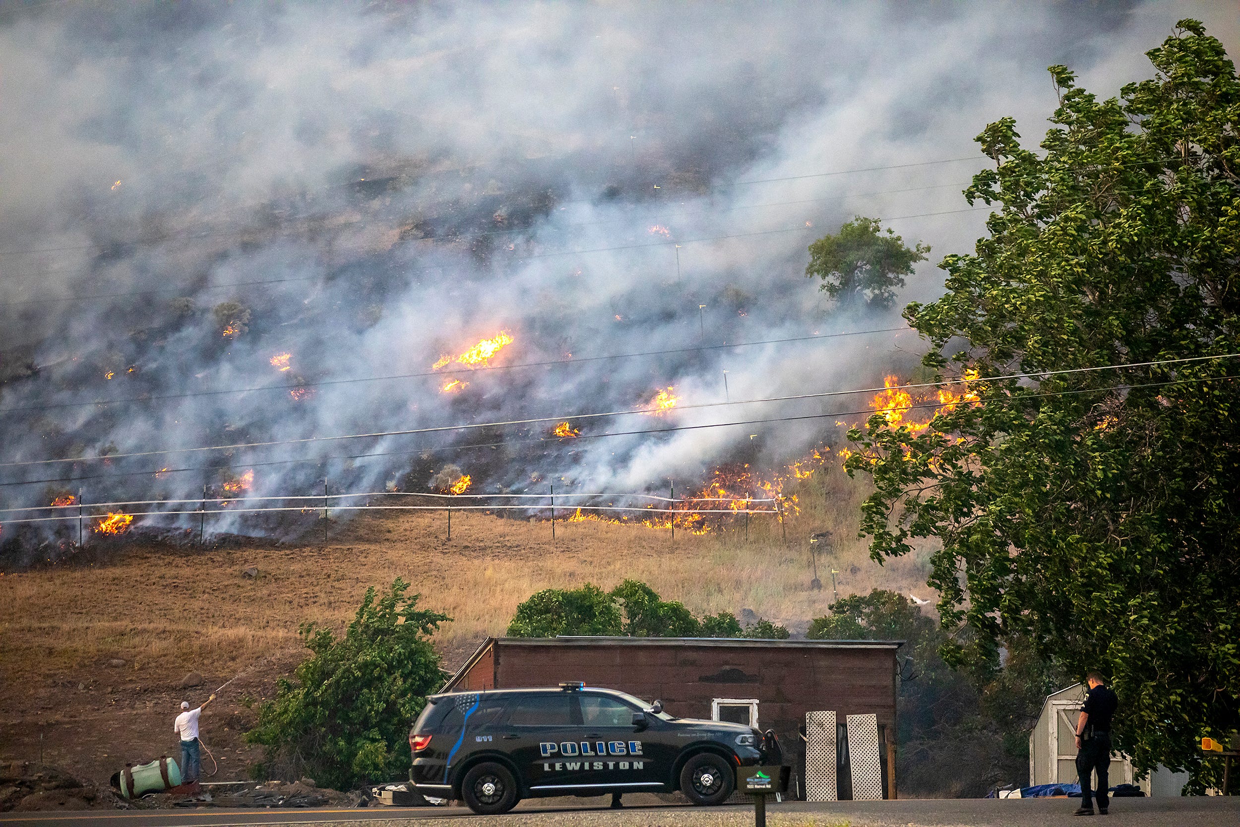 Lewiston police look on as a person uses a hose to keep the ground damp as strong winds push flames along the hills nearby, Saturday, May 31, 2025, in north Lewiston, Idaho. (Photo by USA Today)