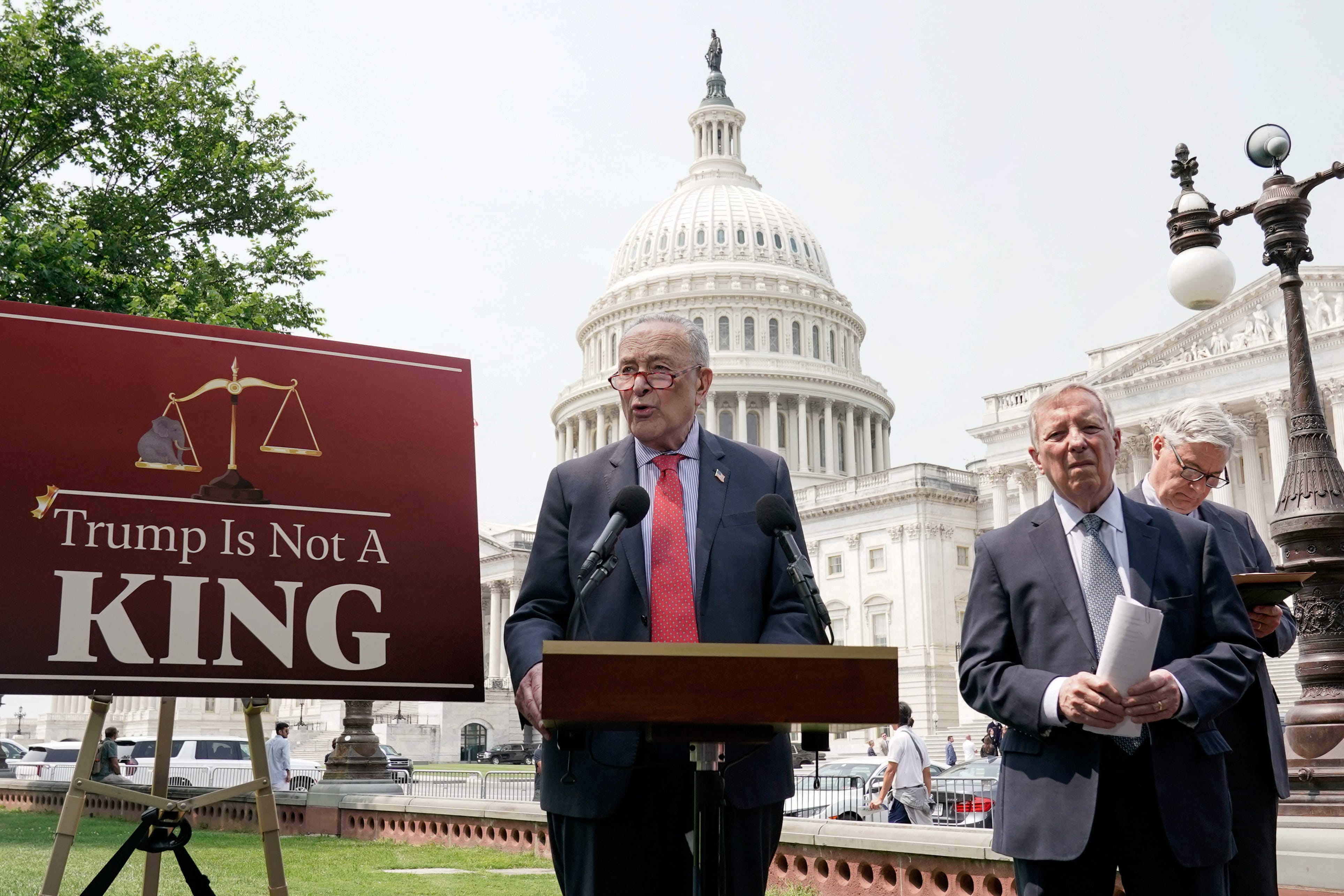 US Senate Minority Leader Chuck Schumer (L), Democrat from New York, speaks alongside Senator Dick Durbin (2nd R), Democrat from Illinois, and Senator Sheldon Whitehouse (R), Democrat from Rhode Island, during a news conference on the President Trump-backed Republican policy and budget bill and the impacts it could have on the federal court system, outside the US Capitol on June 5, 2025, in Washington, DC. US senators have begun weeks of what is expected to be fierce debate over the policy package President Donald Trump hopes will seal his legacy, headlined by tax cuts slated to add up to $3 trillion to the nation's debt. (Photo by Oliver Contreras/AFP Photo)