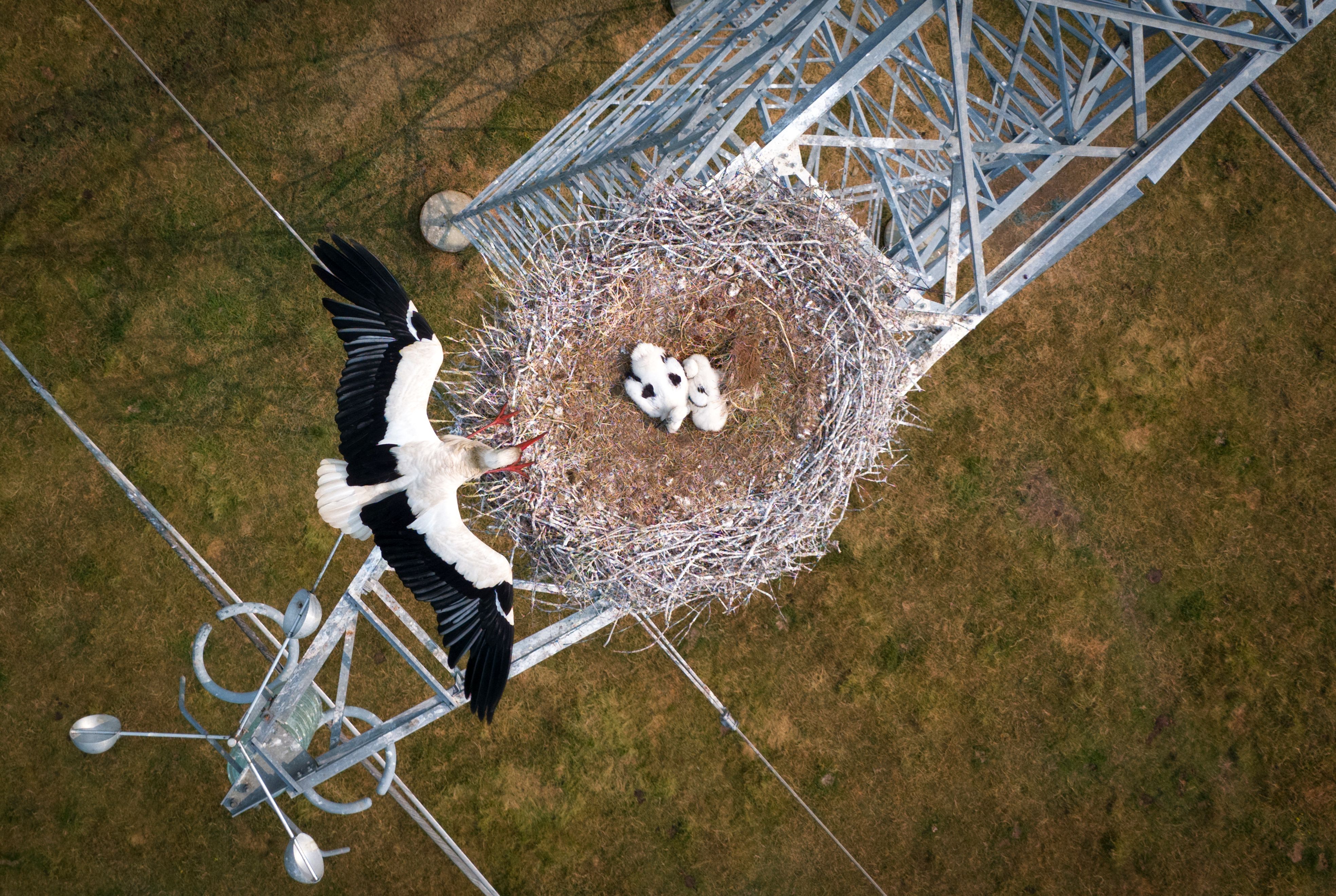 This aerial photograph shows a stork with two chicks on a nest installed on a high voltage line mast in Bouee, western France, on June 3, 2025. (Photo by Loïc Venance/AFP Photo)