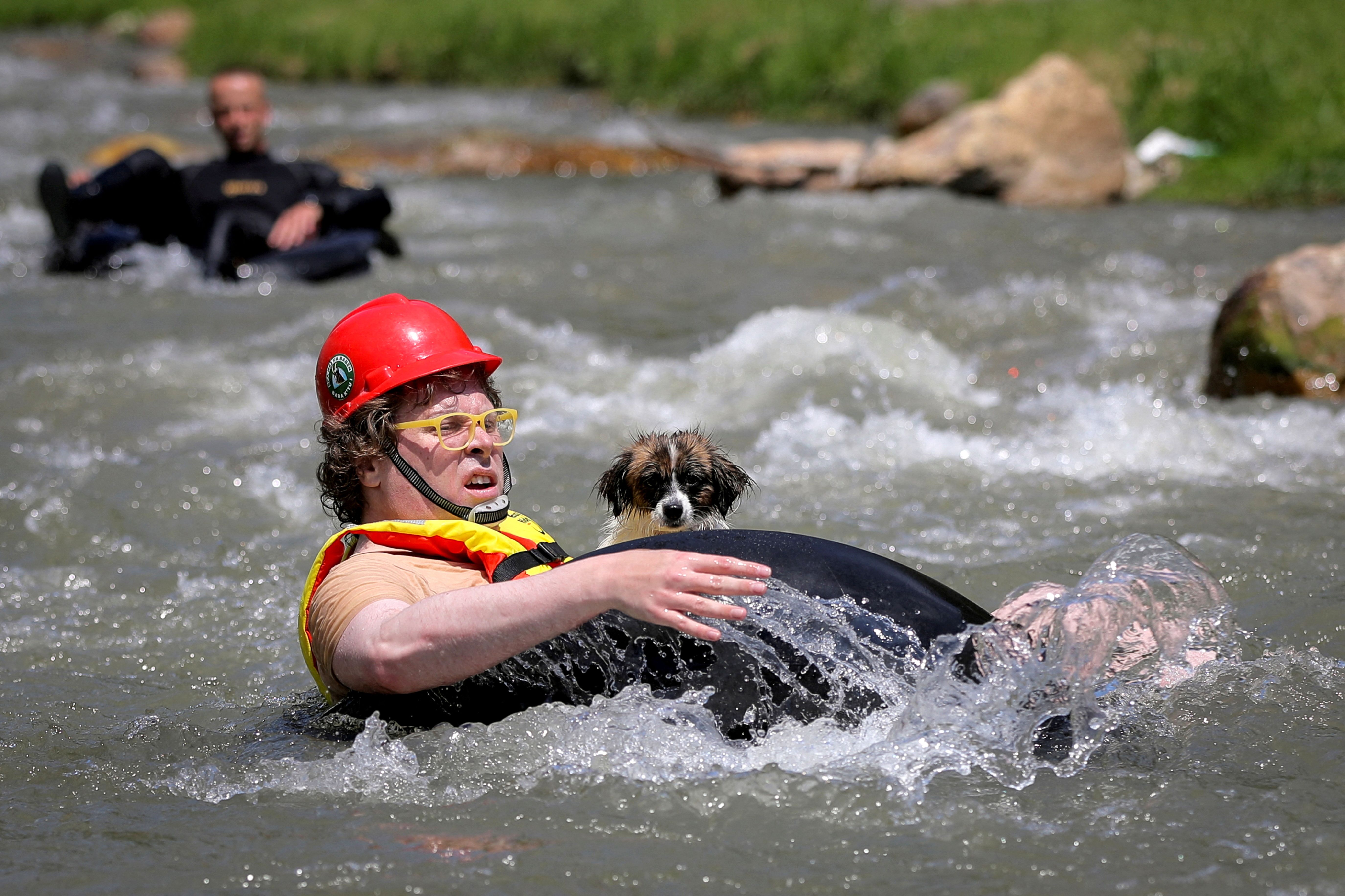 A sport enthusiast holding his dog competes during the tyre festival “Bunar Fest” as he navigates rocky obstacles while floating on inner tyre tubes in the chilly Lumbardhi river, in Prizren, Kosovo on June 1, 2025. (Photo by Valdrin Xhemaj/Reuters)