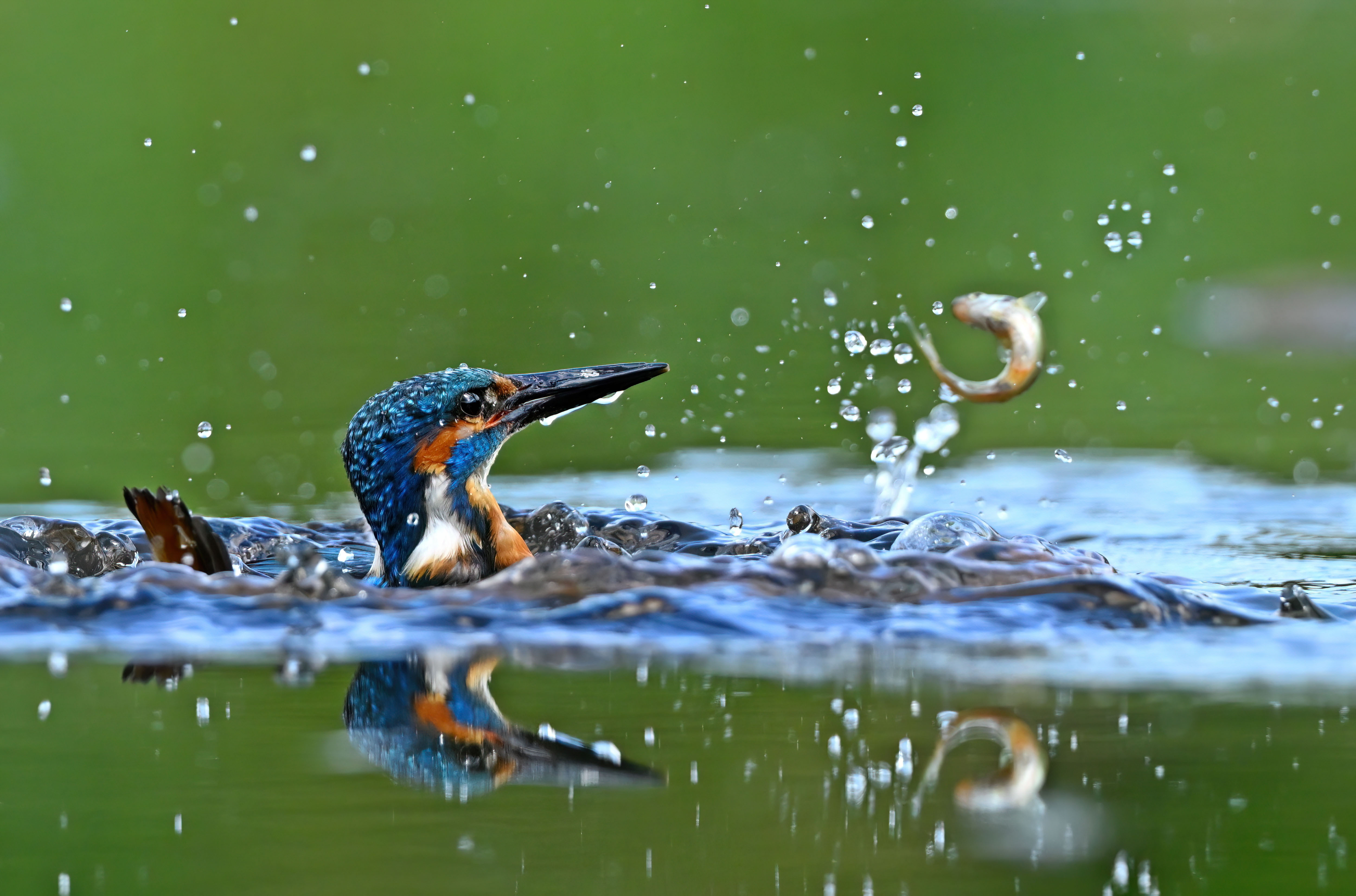 A kingfisher plunged into the water in Trowbridge, Wiltshire, UK in the first decade of June 2025, to grab a fish for lunch – but its prey twisted free in a last-second escape. (Photo by Alan Benson/Caters News Agency)