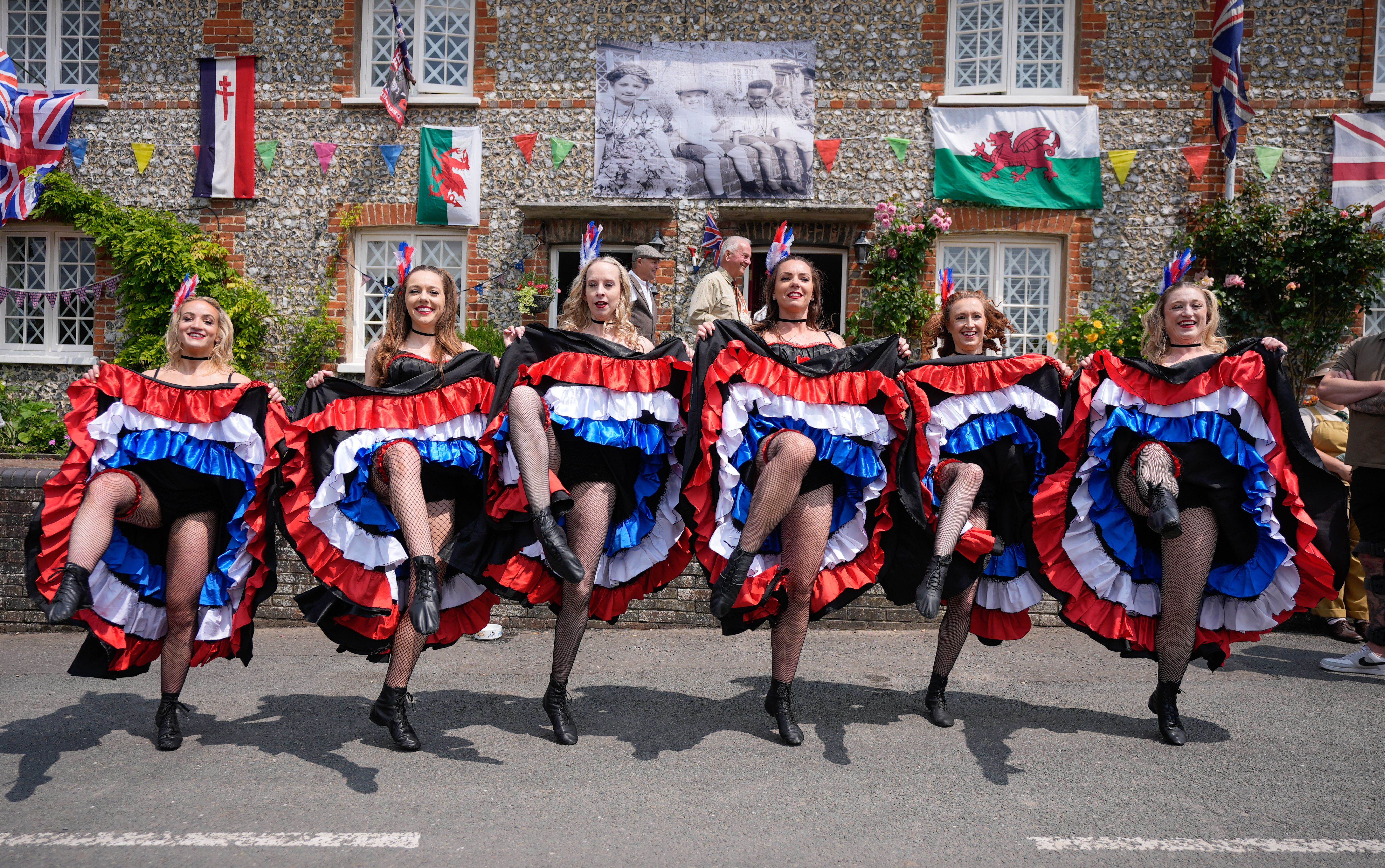Members of The Butterflies event dancers perform a can-can dance in Southwick High Street during the Southwick Revival, a nostalgic event commemorating the D-Day Landings, at Southwick, Hampshire, UK on Sunday, June 8, 2025. (Photo by Andrew Matthews/PA Images via Getty Images)