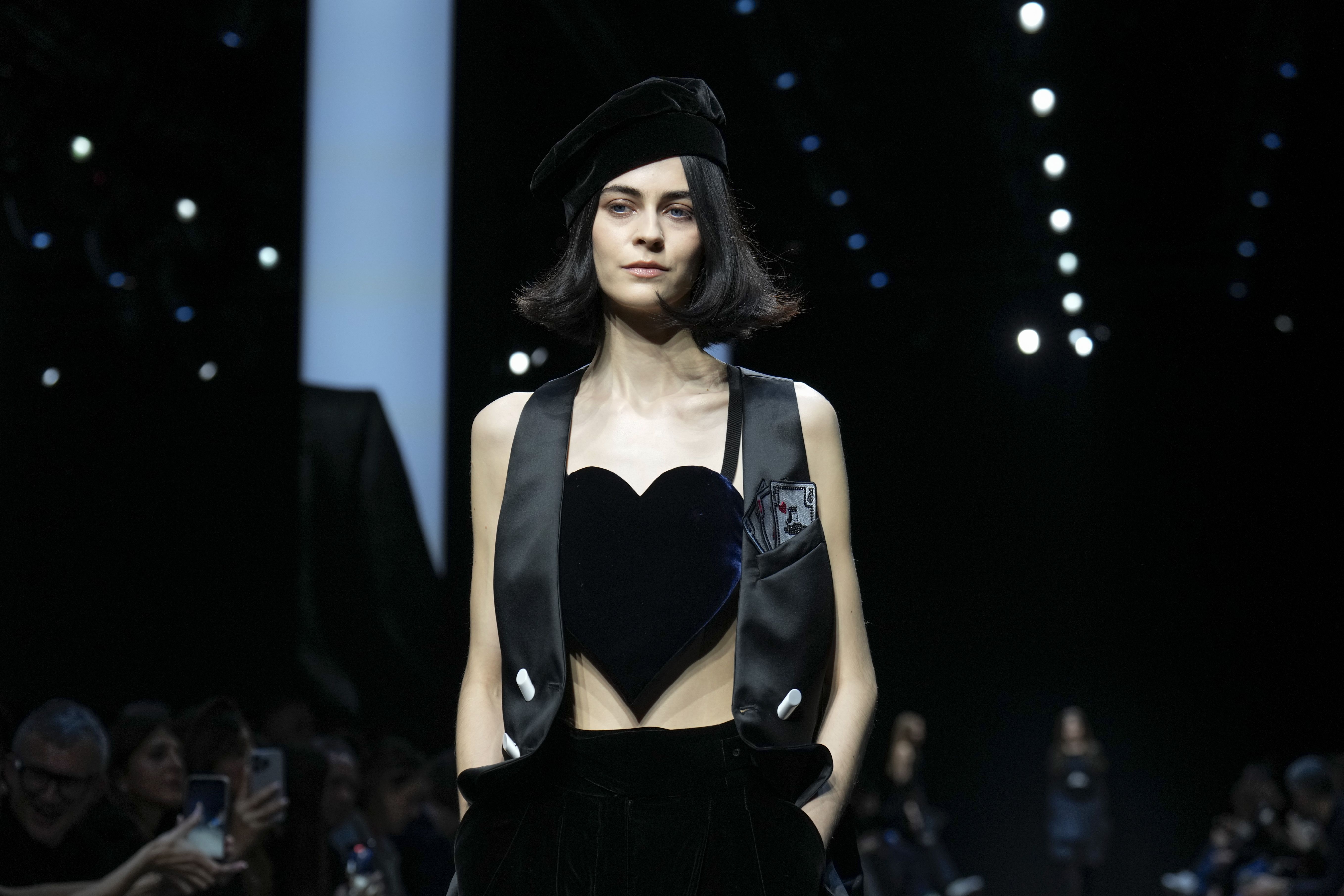 A model wears a creation as part of the Emporio Armani Fall/Winter 2025-2026 Womenswear collection presented in Milan, Italy, Thursday, February 27, 2025. (Photo by Luca Bruno/AP Photo)